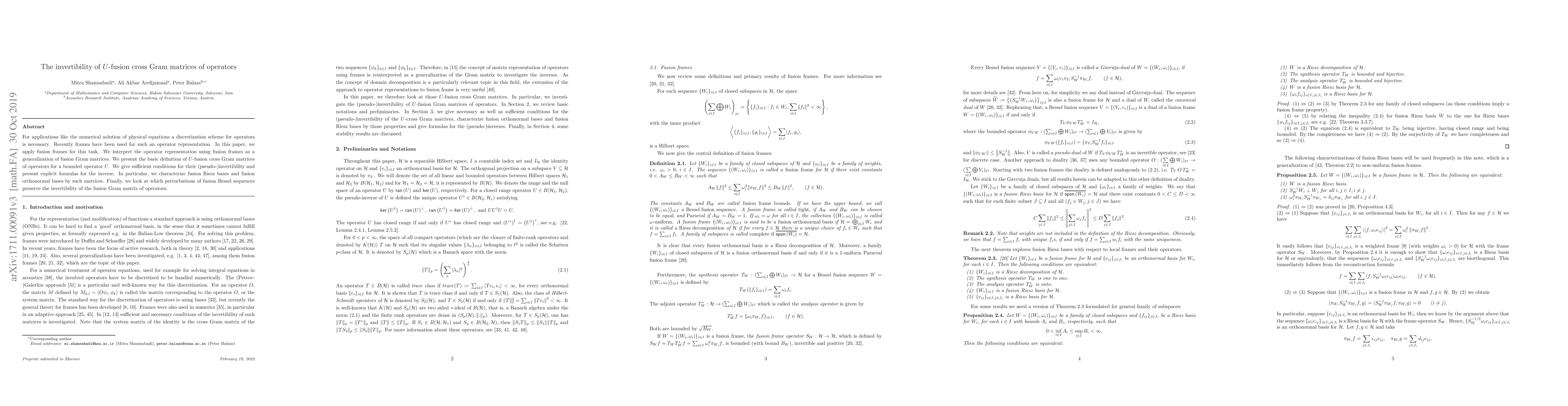 This paper defines $U$-fusion cross Gram matrices for operator representations using fusion frames and provides conditions for their (pseudo-)invertibility, including explicit inversion formulas. It also explores how perturbations of fusion Bessel sequences affect the invertibility of fusion Gram matrices.