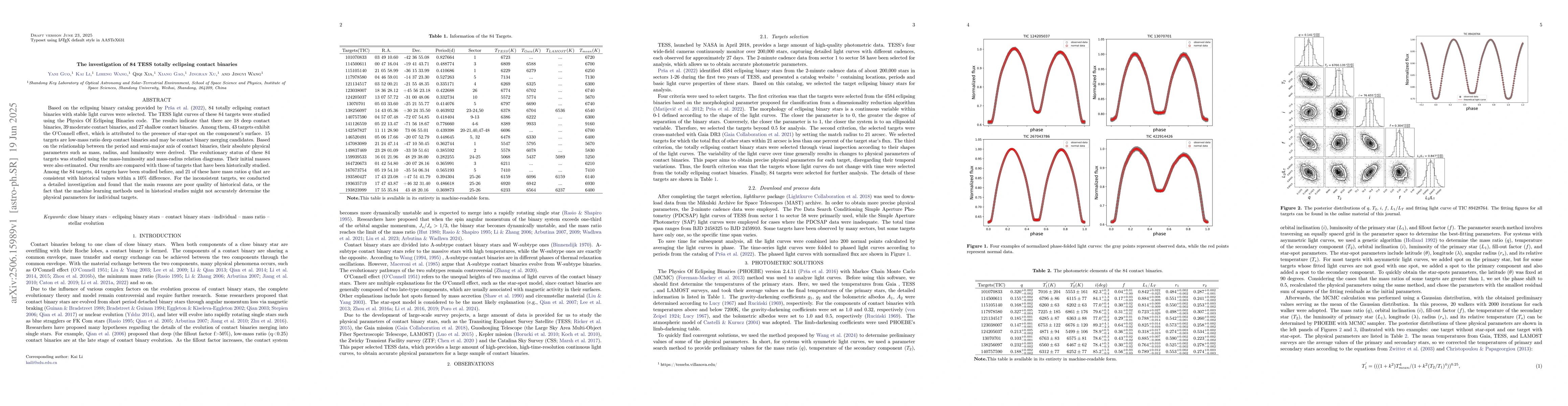 Based on the eclipsing binary catalog provided by \cite{2022ApJS..258...16P}, 84 totally eclipsing contact binaries with stable light curves were selected. The TESS light curves of these 84 targets were studied using the Physics Of Eclipsing Binaries code. The results indicate that there are 18 deep contact binaries, 39 moderate contact binaries, and 27 shallow contact binaries. Among them, 43 targets exhibit the O'Connell effect, which is attributed to the presence of star-spot on the component's surface. 15 targets are low-mass ratio deep contact binaries and may be contact binary merging candidates. Based on the relationship between the period and semi-major axis of contact binaries, their absolute physical parameters such as mass, radius, and luminosity were derived. The evolutionary status of these 84 targets was studied using the mass-luminosity and mass-radius relation diagrams. Their initial masses were also estimated. Our results are compared with those of targets that have been historically studied. Among the 84 targets, 44 targets have been studied before, and 21 of these have mass ratios $q$ that are consistent with historical values within a 10\% difference. For the inconsistent targets, we conducted a detailed investigation and found that the main reasons are poor quality of historical data, or the fact that the machine learning methods used in historical studies might not accurately determine the physical parameters for individual targets.