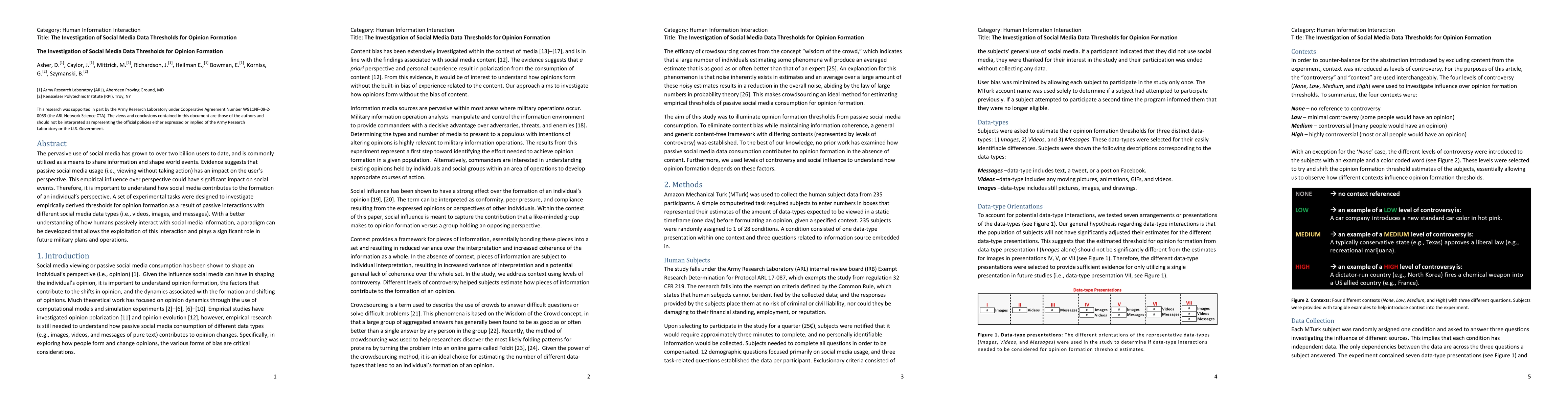 This paper investigates how passive social media usage influences opinion formation through experimental tasks analyzing different data types. Understanding these thresholds can inform future military strategies and operations.
