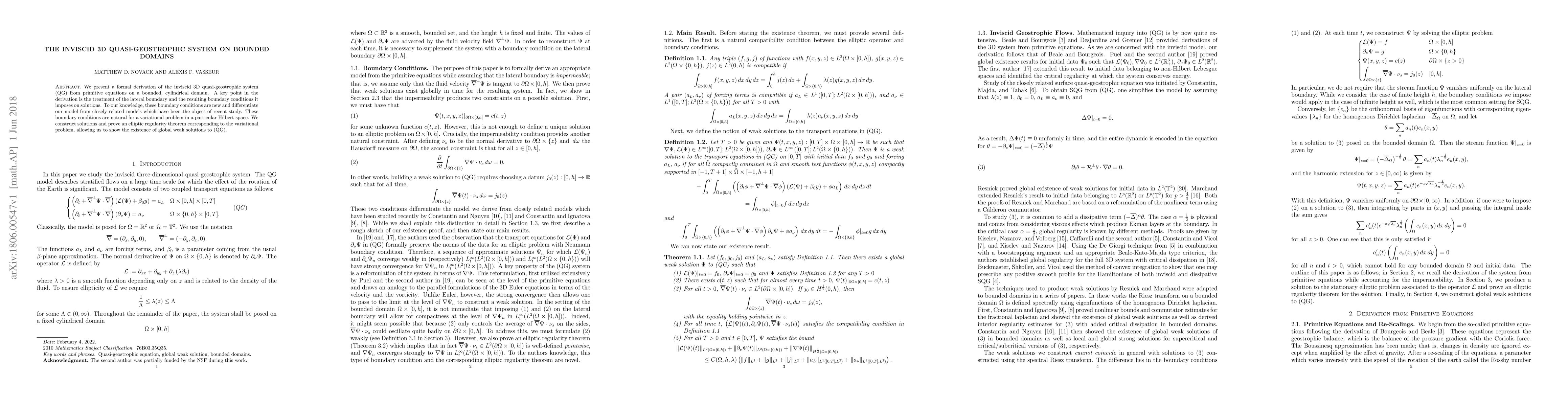 The paper derives a new 3D quasi-geostrophic system on bounded domains, introducing unique boundary conditions that ensure global weak solutions exist.