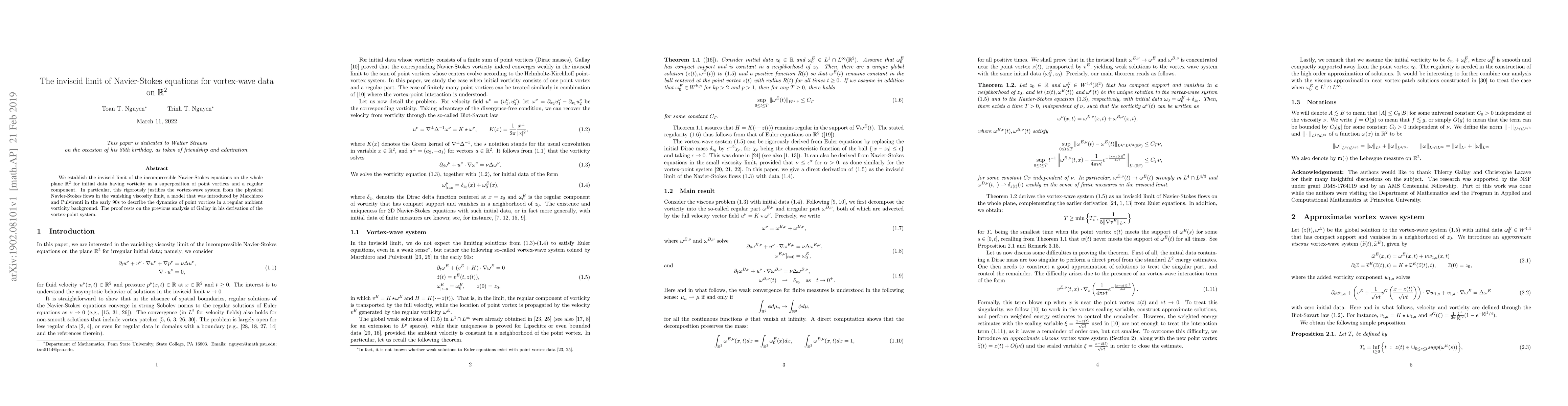 This paper rigorously proves the inviscid limit of Navier-Stokes equations on $mathbb{R}^2$, justifying the vortex-wave system from physical Navier-Stokes flows as viscosity approaches zero. It builds upon previous analysis for vortex-point systems.