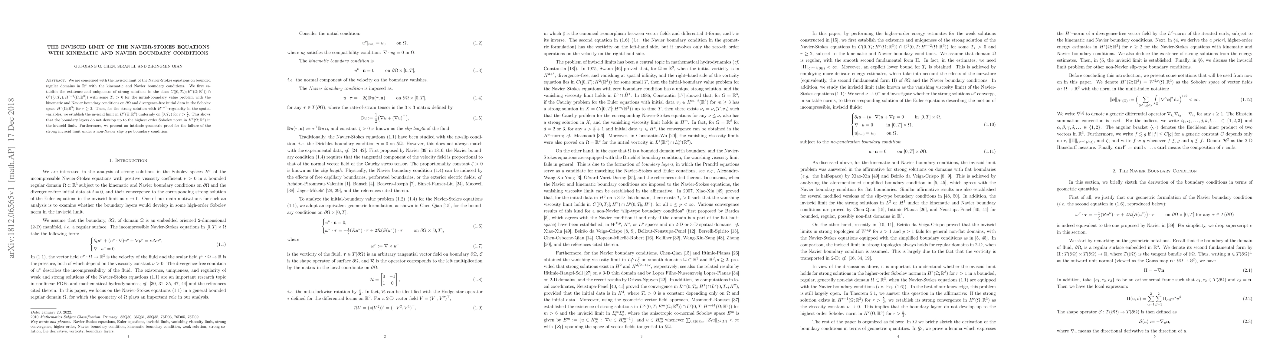 This paper investigates the inviscid limit of the Navier-Stokes equations with kinematic and Navier boundary conditions in $\mathbb{R}^3$. It establishes the existence and uniqueness of strong solutions and proves the inviscid limit for these solutions, showing no boundary layer development up to a certain Sobolev norm. It also demonstrates the failure of the strong inviscid limit under non-Navier slip-type boundary conditions.