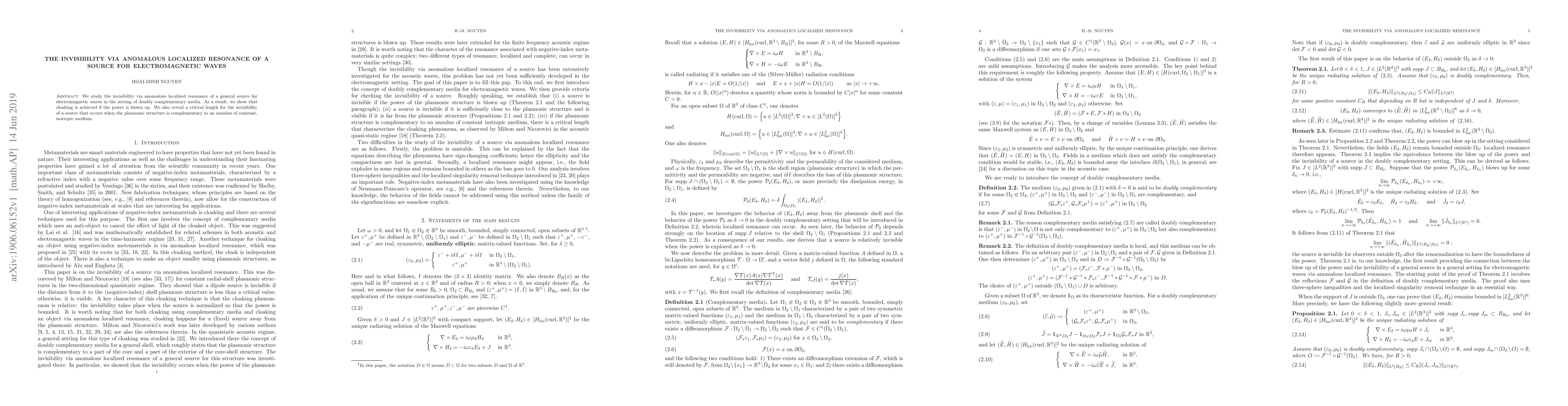 Summary: This paper explores electromagnetic cloaking through anomalous localized resonance in doubly complementary media, demonstrating that invisibility is achievable by amplifying the source power, and identifies a critical length for cloaking when the plasmonic structure complements an annulus of isotropic medium.