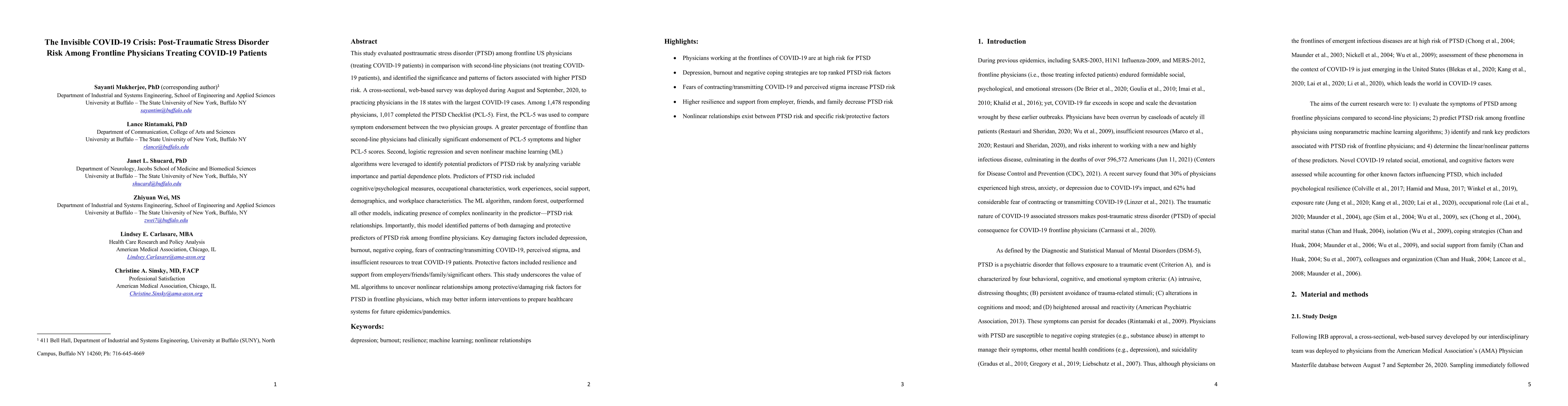 This study reveals higher PTSD risk among frontline US physicians treating COVID-19 compared to second-line physicians, identified through a web-based survey. Machine learning models highlighted both damaging and protective factors, emphasizing the need for targeted interventions to support frontline healthcare workers.