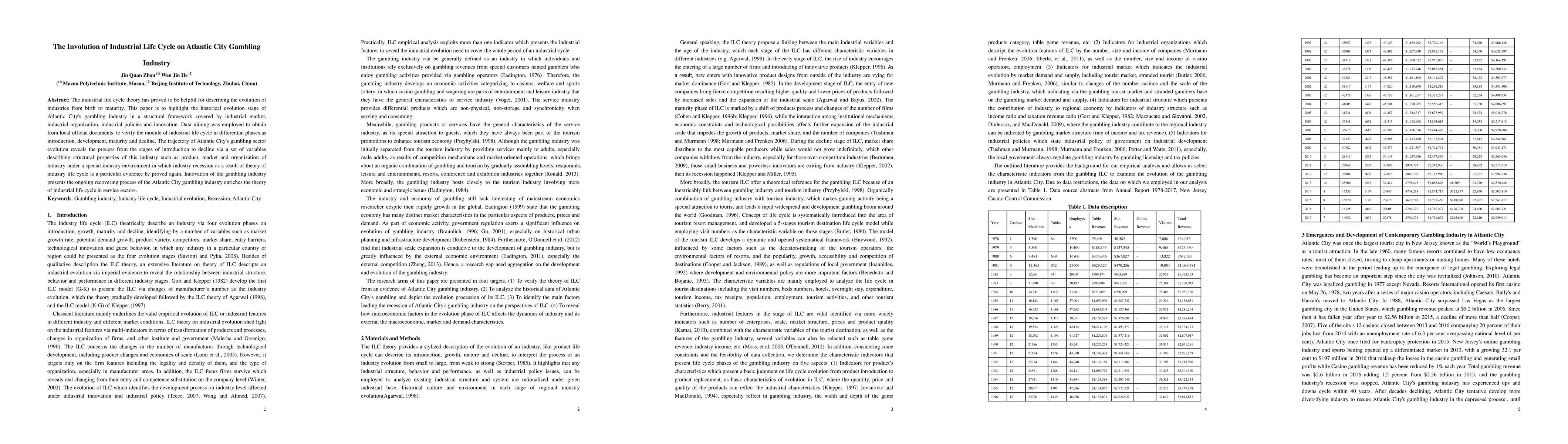 This paper examines the industrial life cycle of Atlantic City's gambling industry, utilizing data mining from local documents to illustrate its evolution from introduction through maturity and decline. The study validates the industrial life cycle theory, showing how innovation is aiding the industry's recovery.