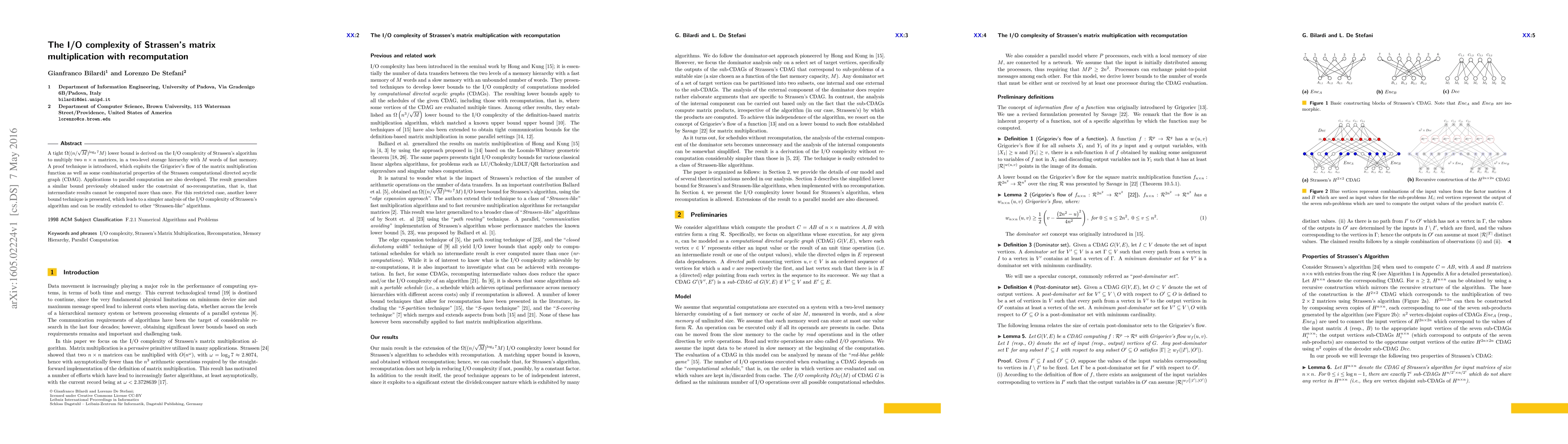 This paper establishes a tight $\Omega((n/\sqrt{M})^{\log_2 7}M)$ lower bound on the I/O complexity of Strassen's matrix multiplication algorithm in a two-level storage hierarchy, allowing for recomputation. It introduces a novel proof technique leveraging Grigoriev's flow and combinatorial properties of Strassen's CDAG, with implications for parallel computation.