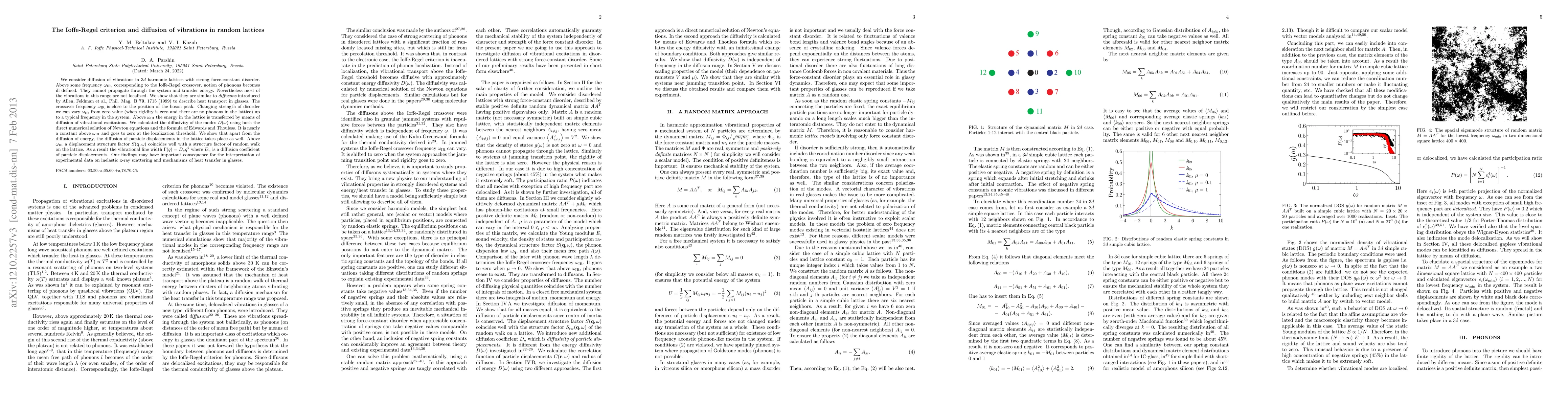 This paper investigates the diffusion of vibrations in 3D harmonic lattices with significant force-constant disorder, demonstrating that above the Ioffe-Regel crossover frequency, phonons lose their definition and energy transfer occurs via diffusons. The study finds that vibrational diffusion is nearly constant and linked to the diffusion of particle displacements, with implications for interpreting experimental data on inelastic x-ray scattering and heat transfer mechanisms in glasses.