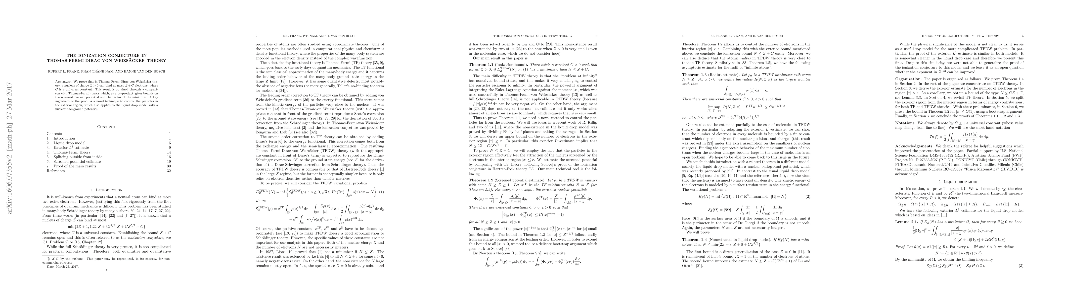 The paper proves the ionization conjecture in Thomas-Fermi-Dirac-von Weizsäcker theory, establishing that a nucleus can bind at most $Z+C$ electrons, where $C$ is a universal constant. The proof employs a novel technique to manage particles in the exterior region and compares results with Thomas-Fermi theory to derive bounds on the screened nuclear potential and the radius of the minimizer.