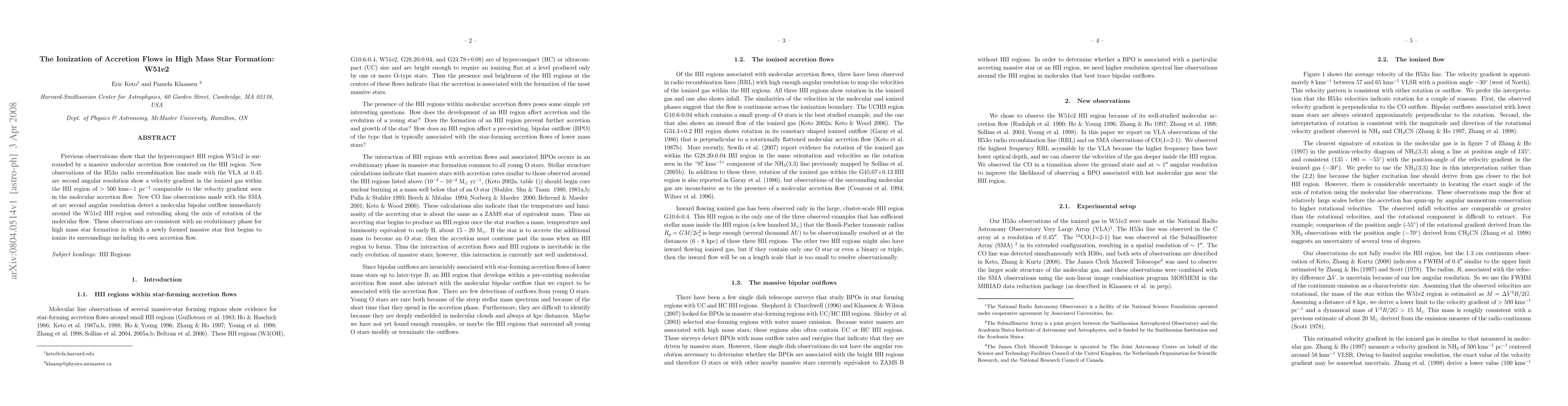 Previous observations show that the hypercompact HII region W51e2 is surrounded by a massive molecular accretion flow centered on the HII region. New observations of the H53alpha radio recombination line made with the VLA at 0.45 arc second angular resolution show a velocity gradient in the ionized gas within the HII region of > 500 kms-1 pc-1 comparable to the velocity gradient seen in the molecular accretion flow. New CO line observations made with the SMA at arc second angular resolution detect a molecular bipolar outflow immediately around the W51e2 HII region and extending along the axis of rotation of the molecular flow. These observations are consistent with an evolutionary phase for high mass star formation in which a newly formed massive star first begins to ionize its surroundings including its own accretion flow.