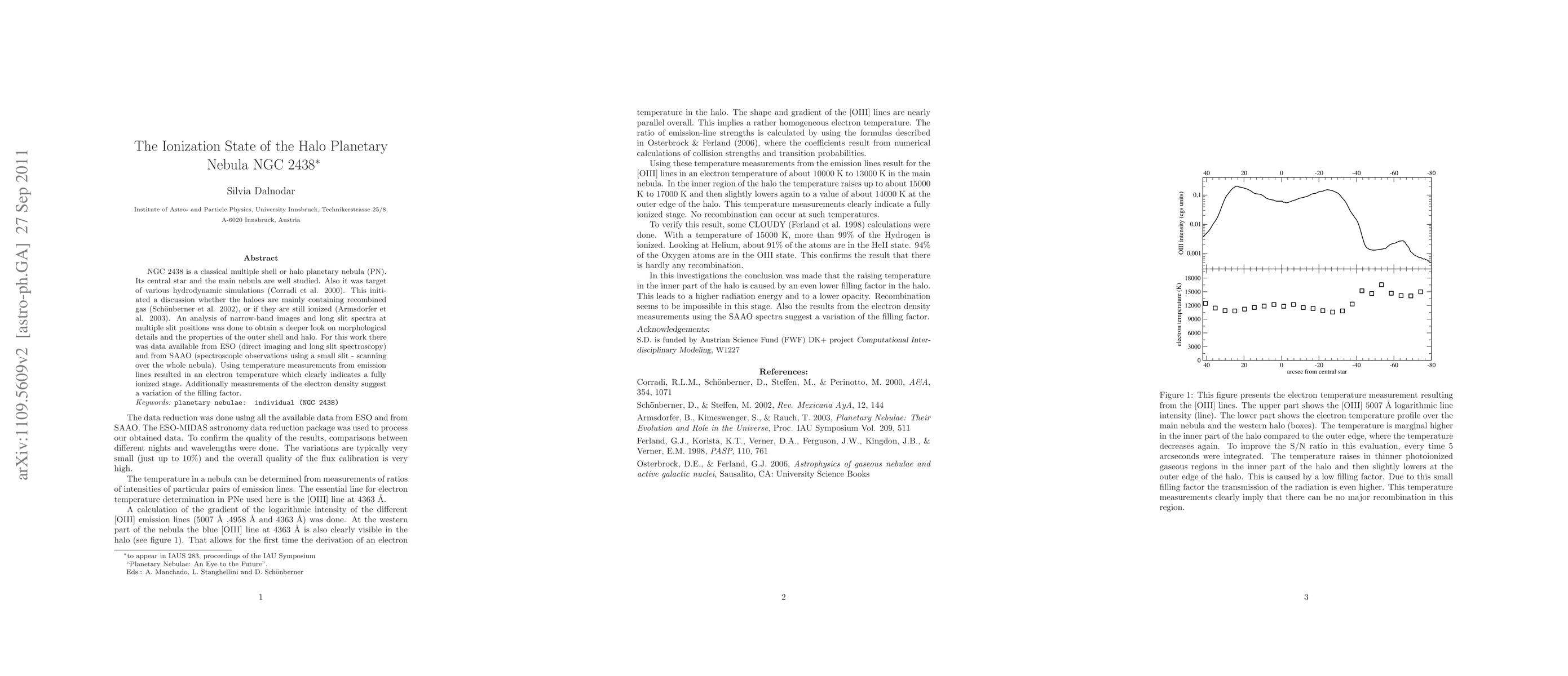 NGC 2438 is a classical multiple shell or halo planetary nebula (PN). Its central star and the main nebula are well studied. Also it was target of various hydrodynamic simulations (Corradi et al. 2000). This initiated a discussion whether the haloes are mainly containing recombined gas (Schoenberner et al. 2002), or if they are still ionized (Armsdorfer et al. 2003). An analysis of narrow-band images and long slit spectra at multiple slit positions was done to obtain a deeper look on morphological details and the properties of the outer shell and halo. For this work there was data available from ESO (direct imaging and long slit spectroscopy) and from SAAO (spectroscopic observations using a small slit - scanning over the whole nebula). Using temperature measurements from emission lines resulted in an electron temperature which clearly indicates a fully ionized stage. Additionally measurements of the electron density suggest a variation of the filling factor.