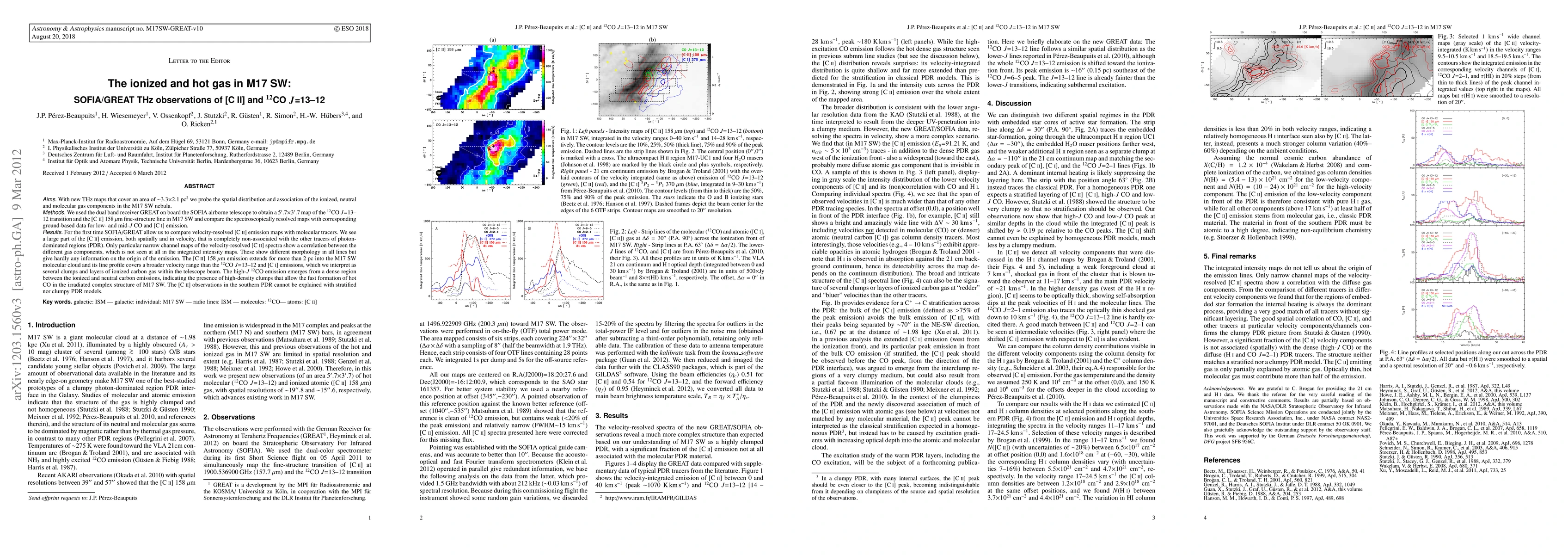 This paper uses SOFIA/GREAT THz observations to analyze the ionized and hot gas in M17 SW, revealing that [C II] emission is largely non-associated with other gas tracers. The study finds that high-J CO emission originates from dense clumps, indicating rapid formation of hot CO in the nebula's complex structure.