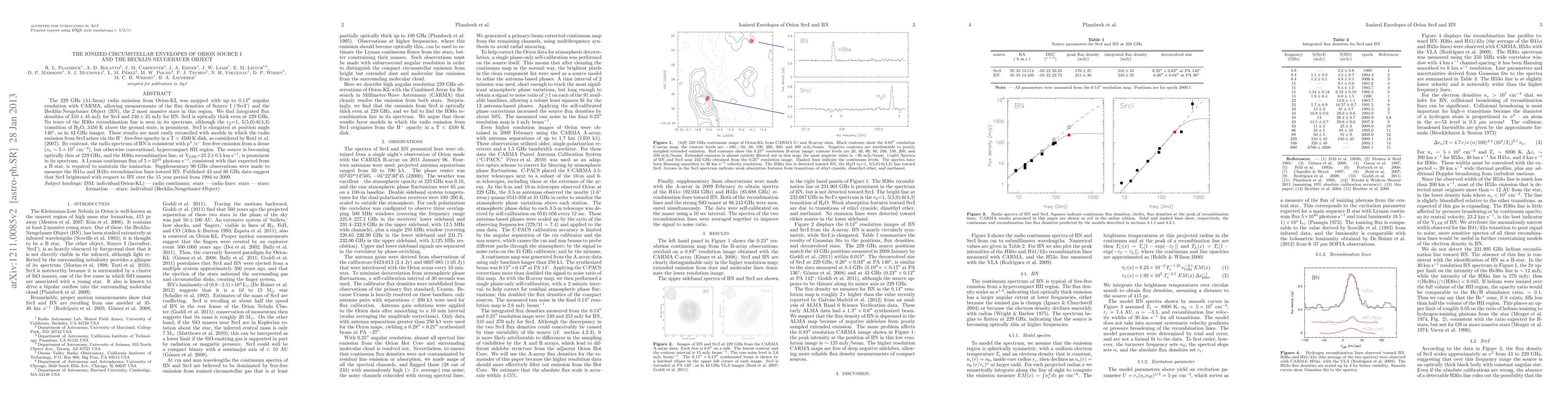 The 229 GHz (lambda 1.3mm) radio emission from Orion-KL was mapped with up to 0.14" angular resolution with CARMA, allowing measurements of the flux densities of Source I ('SrcI') and the Becklin-Neugebauer Object (BN), the 2 most massive stars in this region. We find integrated flux densities of 310 +/- 45 mJy for SrcI and 240 +/- 35 mJy for BN. SrcI is optically thick even at 229 GHz. No trace of the H30alpha recombination line is seen in its spectrum, although the v_2=1, 5(5,0)-6(4,3) transition of H2O, 3450 K above the ground state, is prominent. SrcI is elongated at position angle 140 degrees, as in 43 GHz images. These results are most easily reconciled with models in which the radio emission from SrcI arises via the H- free-free opacity in a T < 4500 K disk, as considered by Reid et al. (2007). By contrast, the radio spectrum of BN is consistent with p+/e- free-free emission from a dense (n_e ~ 5x10^7 cm^{-3}), but otherwise conventional, hypercompact HII region. The source is becoming optically thin at 229 GHz, and the H30alpha recombination line, at VLSR = 23.2 +/- 0.5 km/sec, is prominent in its spectrum. A Lyman continuum flux of 5x10^{45} photons/sec, consistent with that expected from a B star, is required to maintain the ionization. Supplementary 90 GHz observations were made to measure the H41alpha and H42alpha recombination lines toward BN. Published 43 and 86 GHz data suggest that SrcI brightened with respect to BN over the 15 year period from 1994 to 2009.