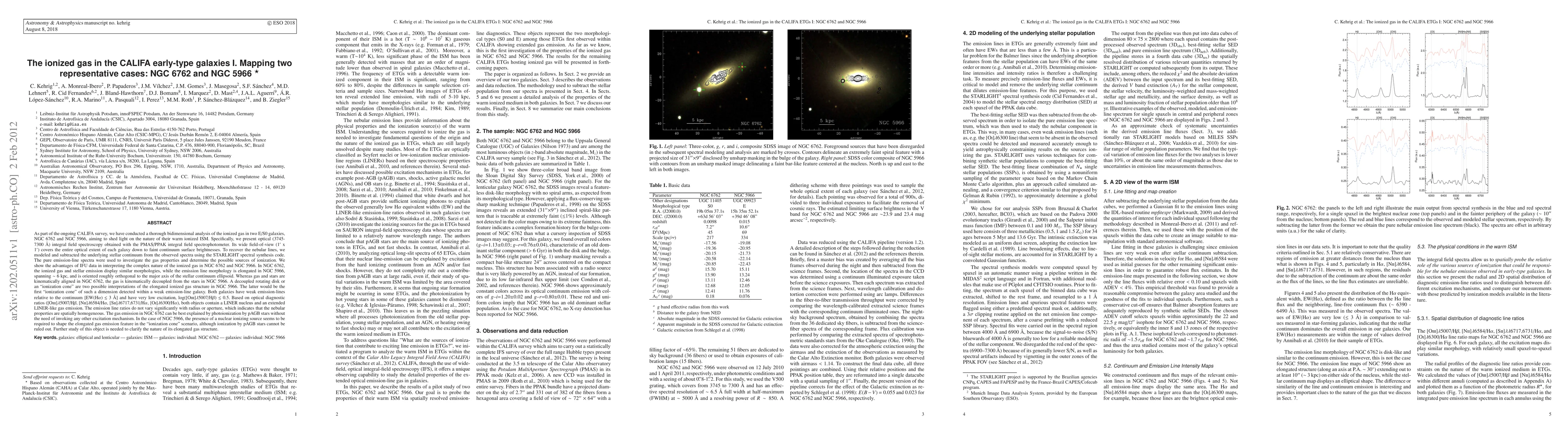 This study investigates the ionized gas in two early-type galaxies, NGC 6762 and NGC 5966, using optical integral field spectroscopy. NGC 6762 shows aligned gas and stellar emission, while NGC 5966 exhibits elongated, kinematically decoupled ionized gas, possibly indicating a rotating disk or an ionization cone. Both galaxies display weak emission lines and low excitation, suggesting LINER-type emission.