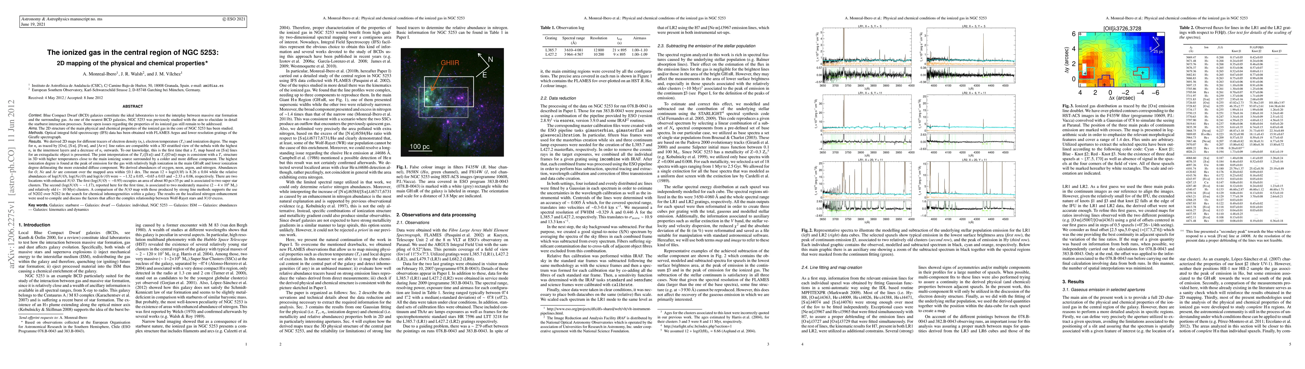 ABRIDGED: NGC5253 was previously studied by our group with the aim to elucidate in detail the starburst interaction processes. Some open issues regarding the 2D structure of the main properties of the ionized gas remain to be addressed. Using IFS data obtained with FLAMES, we derived 2D maps for different tracers of electron density (n_e), electron temperature (T_e) and ionization degree. The maps for n_e as traced by several line ratios are compatible with a 3D stratified view of the nebula with the highest n_e in the innermost layers and a decrease of n_e outwards. To our knowledge, this is the first time that a T_e map based on [SII] lines for an extragalactic object is presented. The joint interpretation of our two T_e maps is consistent with a T_e structure in 3D with higher temperatures close to the main ionizing source surrounded by a colder and more diffuse component. The highest ionization degree is found at the peak of emission for the gas with relatively high ionization in the main GHIIR and lower ionization degree delineating the more extended diffuse component. Abundances for O, Ne and Ar are constant over the mapped area within <0.1 dex. The mean 12+log(O/H) is 8.26 while the relative abundances of log(N/O), log(Ne/O) and log(Ar/O) were \sim-1.32, -0.65 and -2.33, respectively. There are two locations with enhanced N/O. The first (log(N/O)\sim-0.95) is associated to two super star clusters. The second (log(N/O)\sim-1.17), reported here for the first time, is associated to two moderately massive (2-4x10^4 M_sun) and relatively old (\sim10 Myr) clusters. A comparison of the N/O map with those produced by strong line methods supports the use of N2O2 over N2S2 in the search for chemical inhomogeneities within a galaxy. The results on the localized nitrogen enhancement were used to compile and discuss the factors that affect the complex relationship between Wolf-Rayet stars and N/O excess.