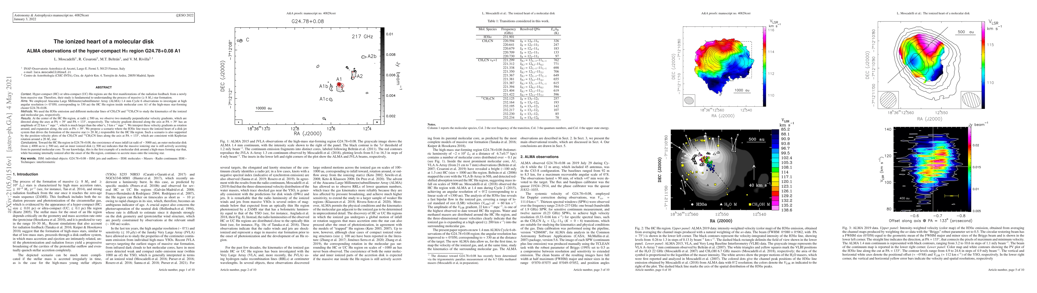 The study of hyper-compact (HC) or ultra-compact (UC) HII regions is fundamental to understanding the process of massive (> 8 M_sun) star formation. We employed Atacama Large Millimeter/submillimeter Array (ALMA) 1.4 mm Cycle 6 observations to investigate at high angular resolution (~0.050", corresponding to 330 au) the HC HII region inside molecular core A1 of the high-mass star-forming cluster G24.78+0.08. We used the H30alpha emission and different molecular lines of CH3CN and 13CH3CN to study the kinematics of the ionized and molecular gas, respectively. At the center of the HC HII region, at radii <~500 au, we observe two mutually perpendicular velocity gradients, which are directed along the axes at PA = 39 deg and PA = 133 deg, respectively. The velocity gradient directed along the axis at PA = 39 deg has an amplitude of 22 km/s mpc^(-1), which is much larger than the other's, 3 km/s mpc^(-1). We interpret these velocity gradients as rotation around, and expansion along, the axis at PA = 39 deg. We propose a scenario where the H30alpha line traces the ionized heart of a disk-jet system that drives the formation of the massive star (~20 M_sun) responsible for the HC HII region. Such a scenario is also supported by the position-velocity plots of the CH3CN and 13CH3CN lines along the axis at PA = 133 deg, which are consistent with Keplerian rotation around a 20 M_sun star. Toward the HC HII region in G24.78+0.08, the coexistence of mass infall (at radii of ~5000 au), an outer molecular disk (from <~4000 au to >~500 au), and an inner ionized disk (<~500 au) indicates that the massive ionizing star is still actively accreting from its parental molecular core. To our knowledge, this is the first example of a molecular disk around a high-mass forming star that, while becoming internally ionized after the onset of the HII region, continues to accrete mass onto the ionizing star.