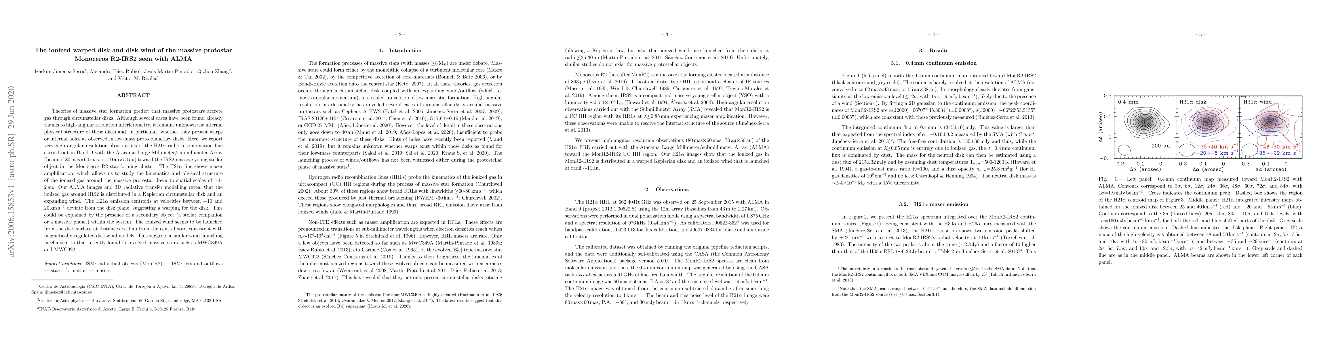 This study using ALMA reveals a warped ionized disk and disk wind around the massive protostar IRS2 in Monoceros R2, suggesting the presence of a secondary object. The H21alpha line indicates a Keplerian disk with a wind launching mechanism consistent with magnetically-regulated models seen in evolved massive stars.