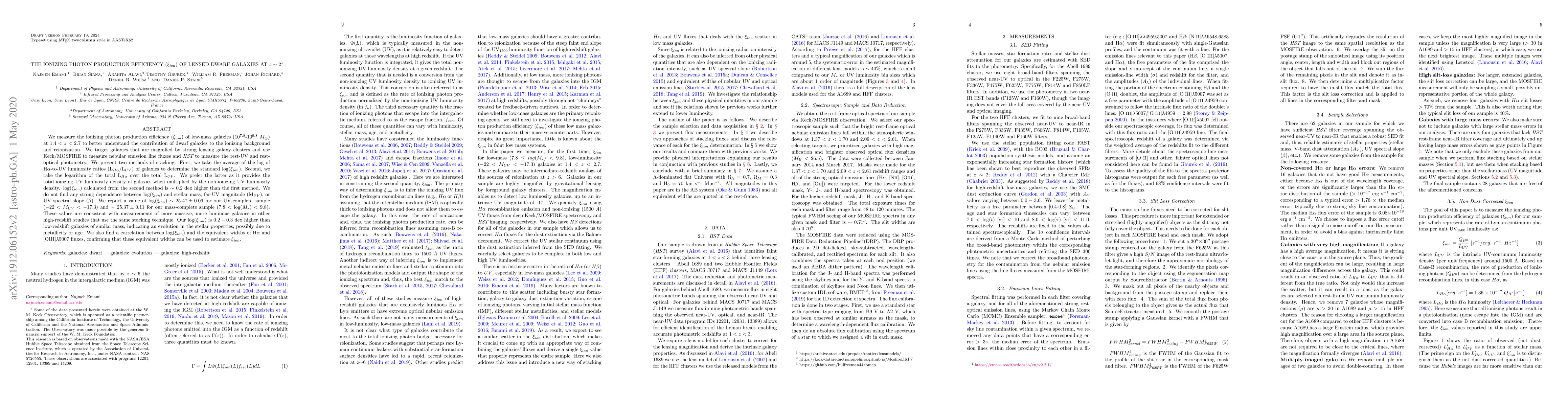 This paper measures the ionizing photon production efficiency ($\xi_{ion}$) of lensed dwarf galaxies at $z \sim 2$, finding log($\xi_{ion}$) values of $\sim25.47$ for UV-complete samples and $\sim25.37$ for mass-complete samples. These values are higher than those for low-redshift galaxies, suggesting evolutionary changes in stellar properties.