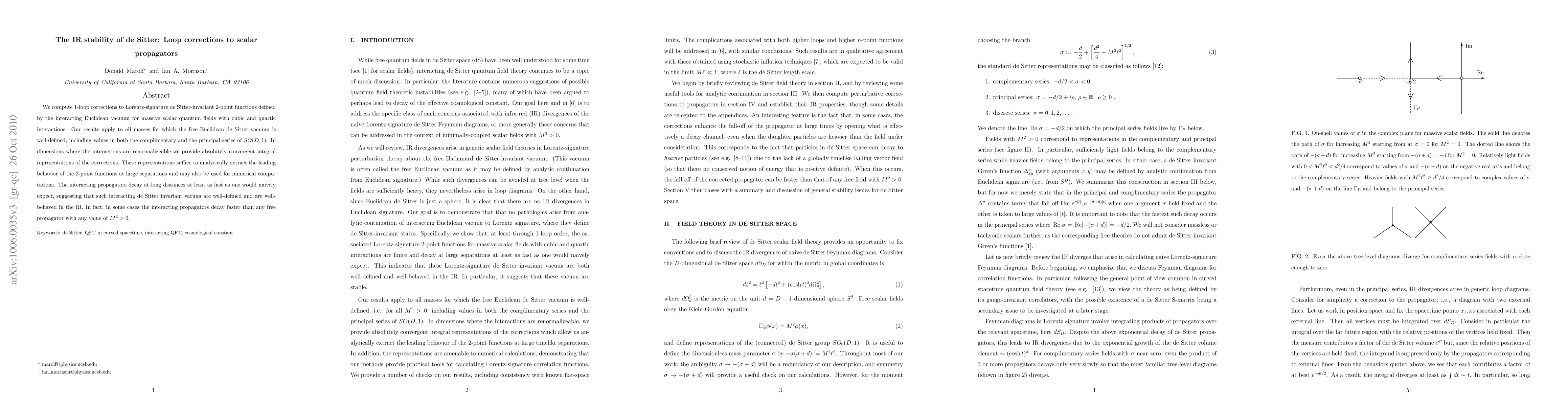 This paper computes 1-loop corrections to de Sitter-invariant 2-point functions for massive scalar fields with cubic and quartic interactions, showing that the interacting propagators decay at least as fast as expected, suggesting well-defined and well-behaved infrared stability for the interacting de Sitter vacuum.
