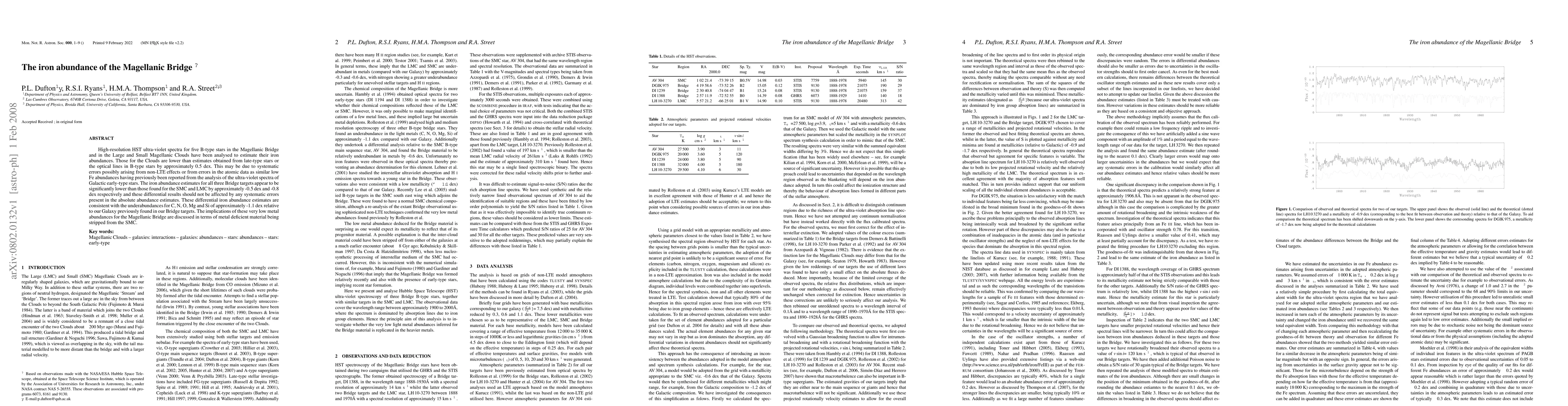 This study uses high-resolution HST spectra to determine iron abundances in five B-type stars along the Magellanic Bridge and in the Magellanic Clouds, finding lower values than previous estimates, likely due to systematic errors. The Bridge's iron abundance is significantly lower than that of the SMC and LMC, suggesting metal-deficient material stripped from the SMC.
