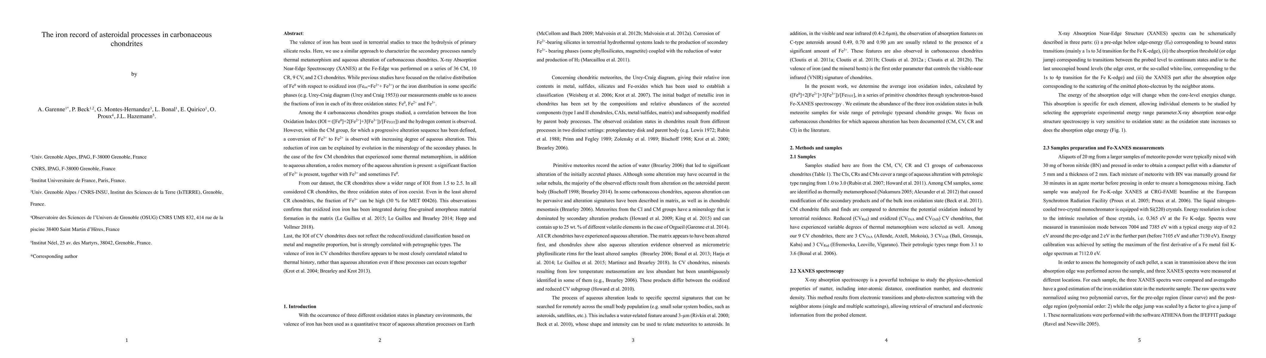 The valence of iron has been used in terrestrial studies to trace the hydrolysis of primary silicate rocks. Here, we use a similar approach to characterize the secondary processes, namely thermal metamorphism and aqueous alteration, that have affected carbonaceous chondrites. X-ray absorption near-edge structure spectroscopy at the Fe-K- edge was performed on a series of 36 CM, 9 CR, 10 CV, and 2 CI chondrites. Among the four carbonaceous chondrites groups studied, a correlation between the iron oxidation index (IOI = [2 ((Fe2+) + 3(Fe3+))/FeTOT) and the hydrogen content is observed. However, within the CM group, for which a progressive alteration sequence has been defined, a conversion of Fe3+ to Fe2+ is observed with increasing degree of aqueous alteration. This reduction of iron can be explained by an evolution in the mineralogy of the secondary phases. In the case of the few CM chondrites that experienced some thermal metamorphism, in addition to aqueous alteration, a redox memory of the aqueous alteration is present: a significant fraction of 3+ 2+ 0 Fe is present, together with Fe and sometimes Fe. From our data set, the CR chondrites show a wider range of IOI from 1.5 to 2.5. In all considered CR chondrites, the three oxidation states of iron coexist. Even in the least-altered CR chondrites, the fraction of Fe3+ can be high (30% for MET 00426). This observation confirms that oxidized iron has been integrated during formation of fine-grained amorphous material in the matrix. Last, the IOI of CV chondrites does not reflect the reduced/oxidized classification based on metal and magnetite proportions, but is strongly correlated with petrographic types. The valence of iron in CV chondrites therefore appears to be most closely related to thermal history, rather than aqueous alteration, even if these processes can occur together .