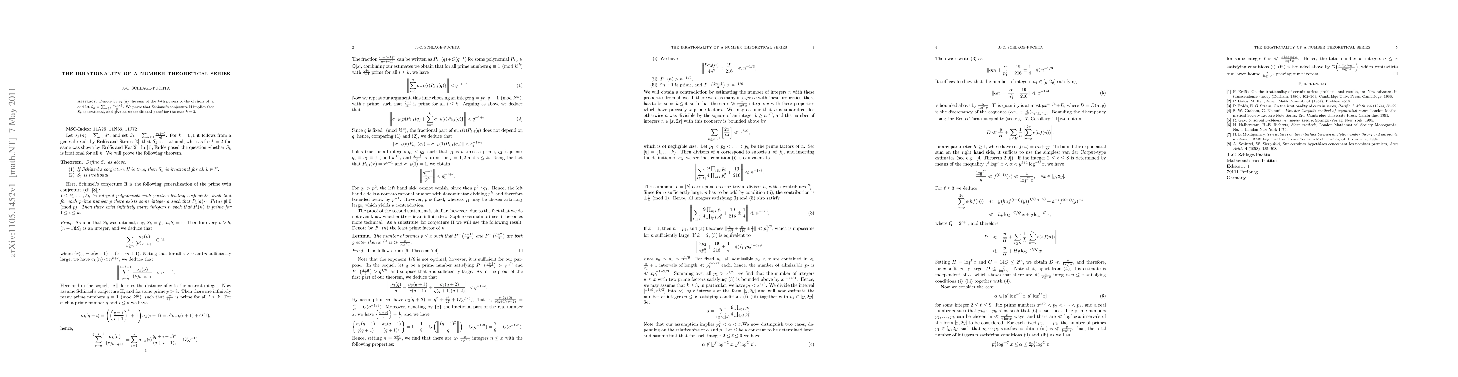 Denote by $\sigma_k(n)$ the sum of the $k$-th powers of the divisors of $n$, and let $S_k=\sum_{n\geq 1}\frac{\sigma_k(n)}{n!}$. We prove that Schinzel's conjecture H implies that $S_k$ is irrational, and give an unconditional proof for the case $k=3$.