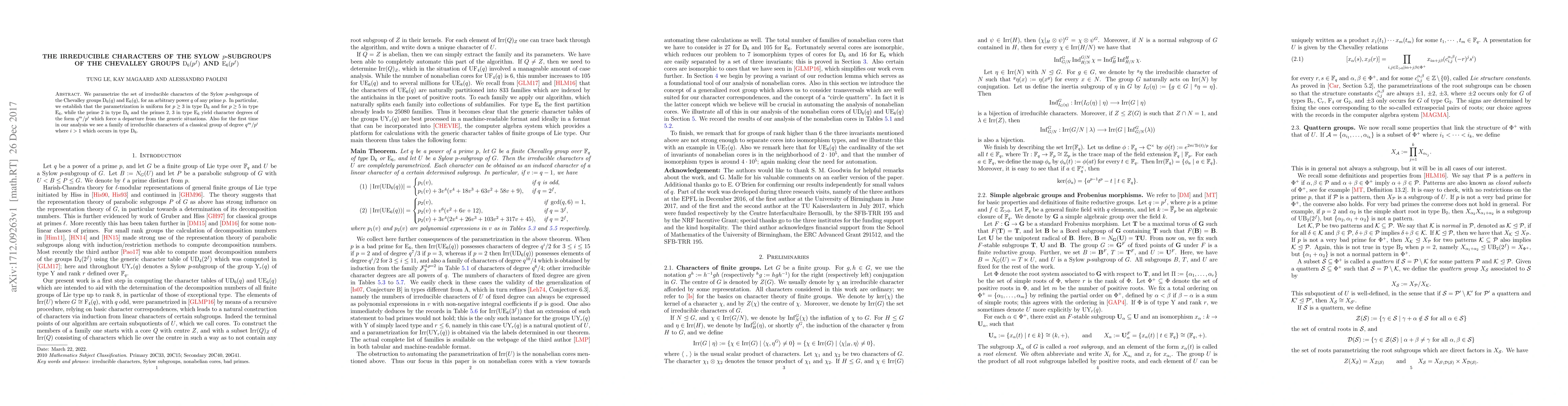 This paper provides a parametrization of the irreducible characters of Sylow $p$-subgroups for Chevalley groups $\mathrm{D}_6(q)$ and $\mathrm{E}_6(q)$, showing uniform behavior for $p \ge 3$ in $\mathrm{D}_6$ and $p \ge 5$ in $\mathrm{E}_6$. It identifies exceptions for $p=2$ in $\mathrm{D}_6$ and $p=2,3$ in $\mathrm{E}_6$, and notes a unique family of characters of degree $q^m/p^i$ with $i > 1$ in $\mathrm{D}_6$.