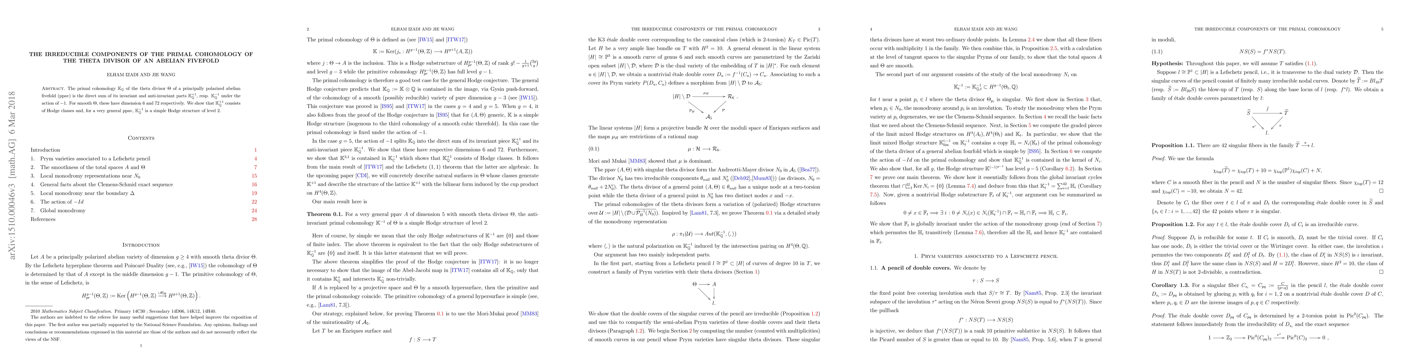 Summary: The paper investigates the primal cohomology of the theta divisor in a principally polarized abelian fivefold, showing that the invariant part consists of Hodge classes and that the anti-invariant part forms a simple Hodge structure of level 2 for a general ppav.