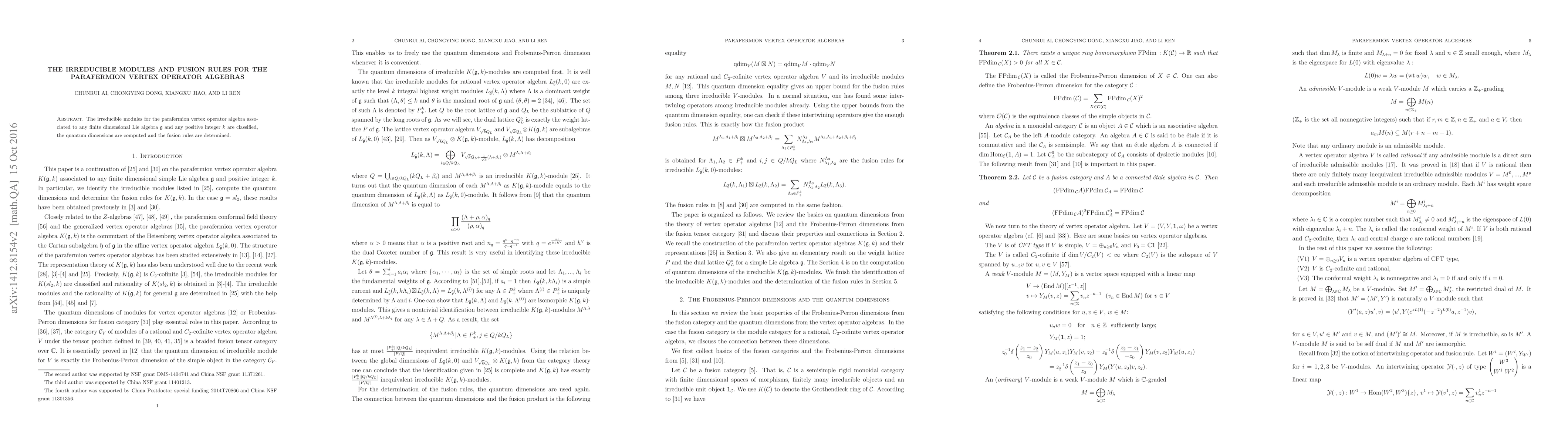 Summary: This paper identifies irreducible modules for parafermion vertex operator algebras, computes their quantum dimensions, and determines the corresponding fusion rules for any finite-dimensional Lie algebra and positive integer.