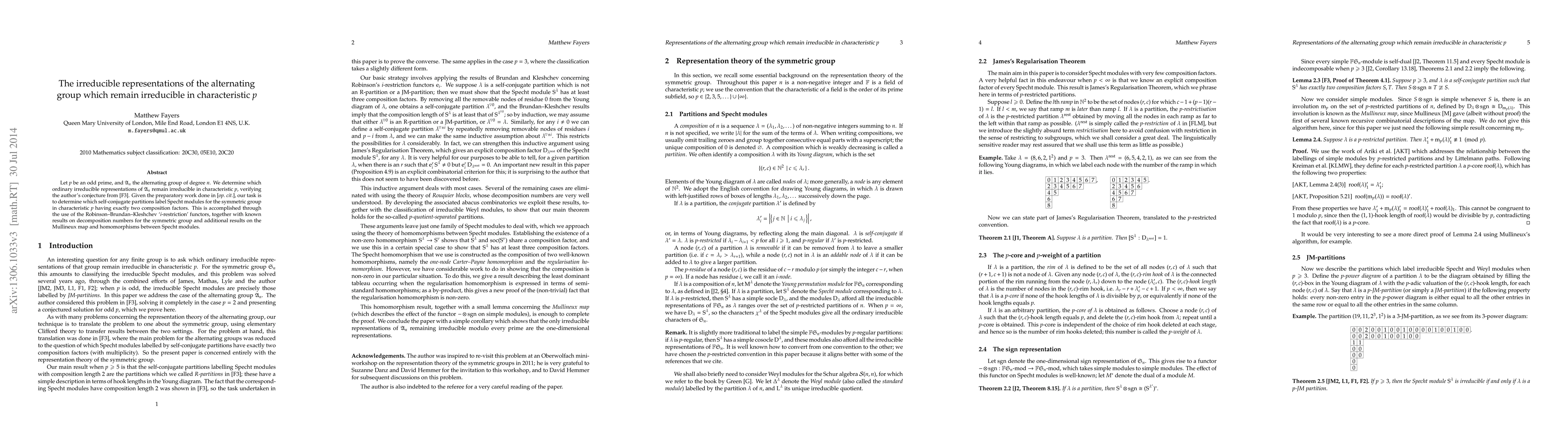 Summary: This paper determines which irreducible representations of the alternating group A_n remain irreducible in characteristic p, confirming a conjecture by verifying which self-conjugate partitions label Specht modules with exactly two composition factors in characteristic p, using 'i-restriction' functors and decomposition numbers.