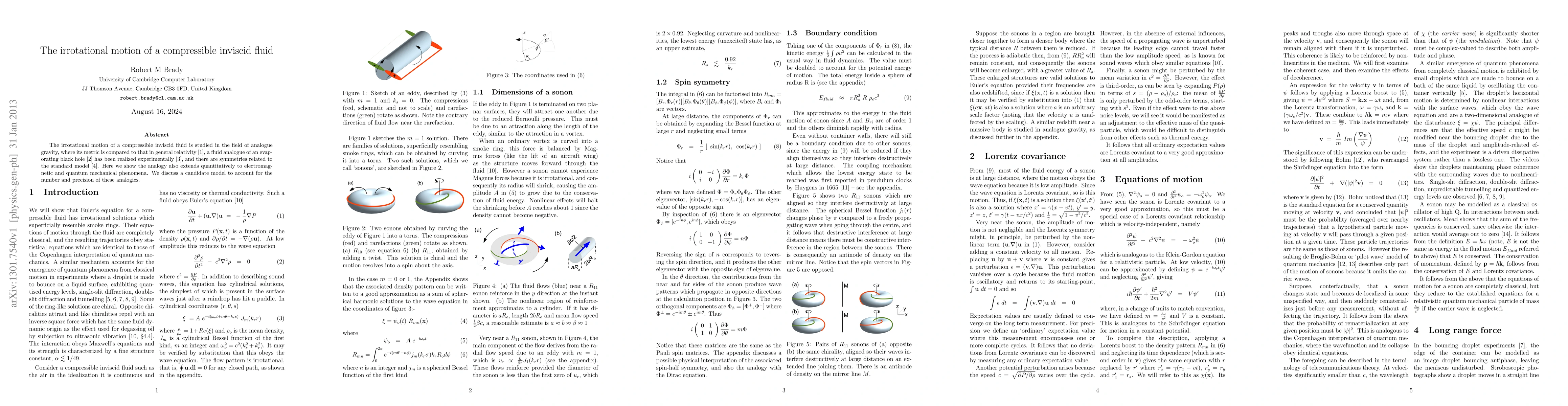 This paper explores the irrotational motion of a compressible inviscid fluid in analogue gravity, demonstrating quantitative analogies to electromagnetic and quantum mechanical phenomena, and proposes a candidate model to explain these extensive parallels.