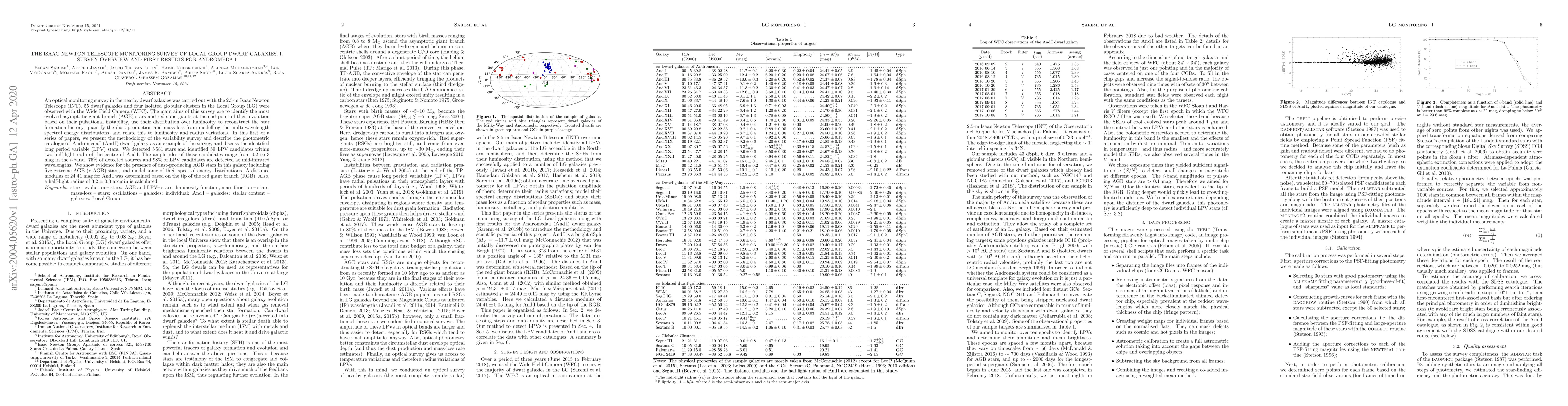 This paper presents the methodology of an optical monitoring survey of Local Group dwarf galaxies using the Isaac Newton Telescope, focusing on identifying evolved stars and reconstructing star formation histories. The first results from Andromeda I reveal 59 long period variable candidates, evidence of dust-producing asymptotic giant branch stars, and a distance modulus of 24.41 mag.