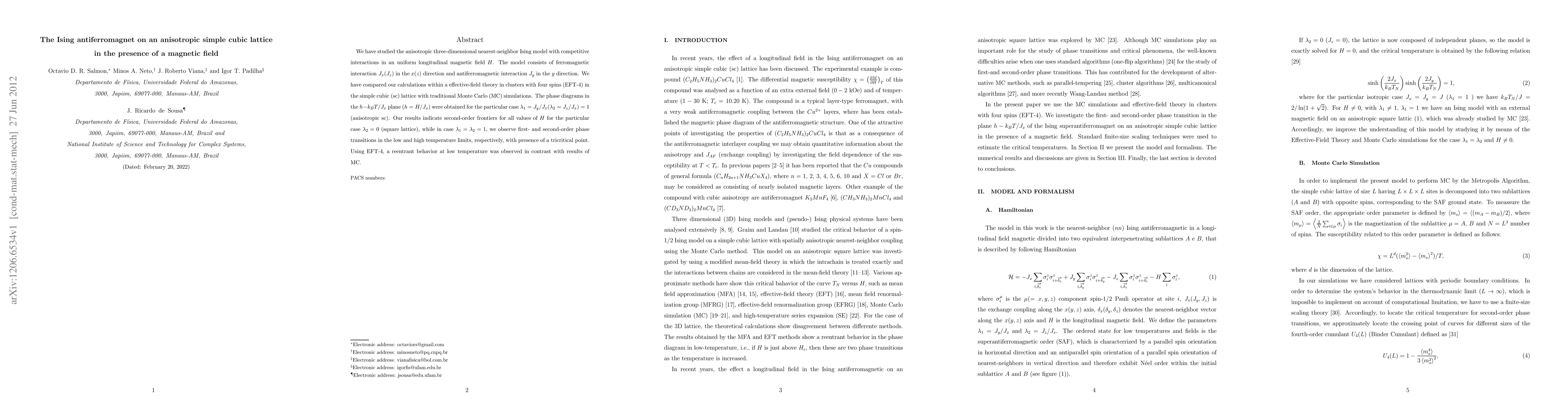We have studied the anisotropic three-dimensional nearest-neighbor Ising model with competitive interactions in an uniform longitudinal magnetic field $H$. The model consists of ferromagnetic interaction $J_{x}(J_{z})$ in the $x(z)$ direction and antiferromagnetic interaction $J_{y}$ in the $y$ direction. We have compared our calculations within a effective-field theory in clusters with four spins (EFT-4) in the simple cubic (sc) lattice with traditional Monte Carlo (MC) simulations. The phase diagrams in the $h-k_{B}T/J_{x}$ plane ($h=H/J_{x}$) were obtained for the particular case $\lambda_{1}=J_{y}/J_{x} (\lambda_{2}=J_{z}/J_{x})=1$ (anisotropic sc). Our results indicate second-order frontiers for all values of $H$ for the particular case $\lambda_{2}=0$ (square lattice), while in case $\lambda_{1}=\lambda_{2}=1$, we observe first- and second-order phase transitions in the low and high temperature limits, respectively, with presence of a tricritical point. Using EFT-4, a reentrant behavior at low temperature was observed in contrast with results of MC.