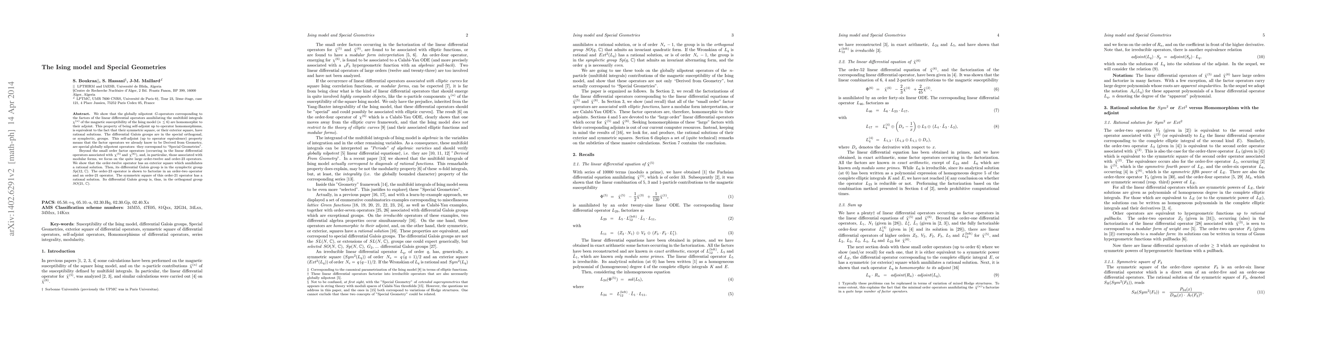 We show that the globally nilpotent G-operators corresponding to the factors of the linear differential operators annihilating the multifold integrals $\chi^{(n)}$ of the magnetic susceptibility of the Ising model ($n \le 6$) are homomorphic to their adjoint. This property of being self-adjoint up to operator homomorphisms, is equivalent to the fact that their symmetric square, or their exterior square, have rational solutions. The differential Galois groups are in the special orthogonal, or symplectic, groups. This self-adjoint (up to operator equivalence) property means that the factor operators we already know to be Derived from Geometry, are special globally nilpotent operators: they correspond to "Special Geometries". Beyond the small order factor operators (occurring in the linear differential operators associated with $ \chi^{(5)}$ and $ \chi^{(6)}$), and, in particular, those associated with modular forms, we focus on the quite large order-twelve and order-23 operators. We show that the order-twelve operator has an exterior square which annihilates a rational solution. Then, its differential Galois group is in the symplectic group $ Sp(12, \mathbb{C})$. The order-23 operator is shown to factorize in an order-two operator and an order-21 operator. The symmetric square of this order-21 operator has a rational solution. Its differential Galois group is, thus, in the orthogonal group $ SO(21, \mathbb{C})$.