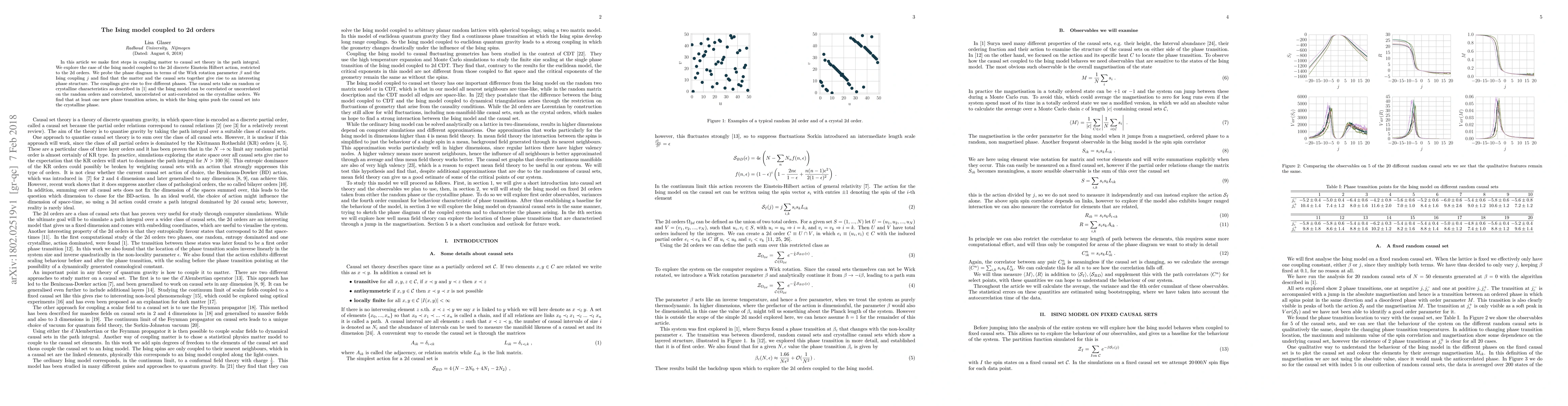 In this article we make first steps in coupling matter to causal set theory in the path integral. We explore the case of the Ising model coupled to the 2d discrete Einstein Hilbert action, restricted to the 2d orders. We probe the phase diagram in terms of the Wick rotation parameter \b{eta} and the Ising coupling j and find that the matter and the causal sets together give rise to an interesting phase structure. The couplings give rise to five different phases. The causal sets take on random or crystalline characteristics as described in [1] and the Ising model can be correlated or uncorrelated on the random ordes and correlated, uncorrelated or anti-correlated on the crystalline orders. We find that at least one new phase transition arises, in which the Ising spins push the causal set into the crystalline phase.