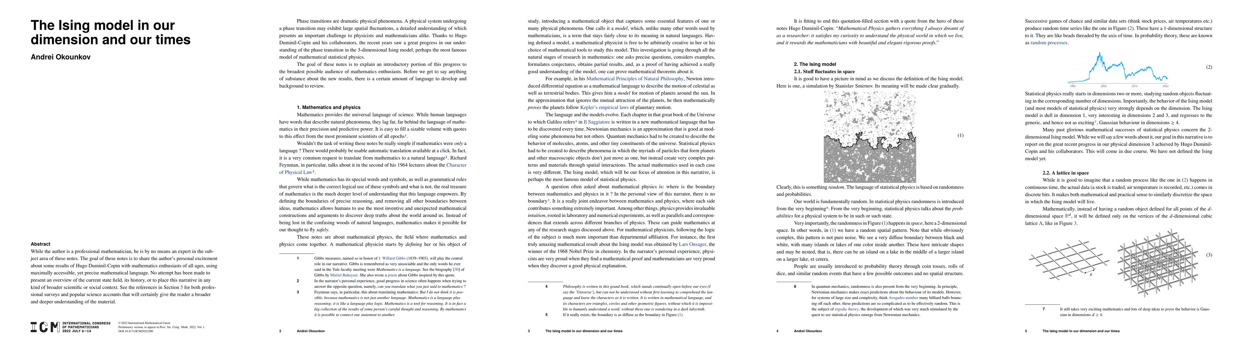 Summary: The article highlights the contributions of Hugo Duminil-Copin, the 2022 Fields Medalist, focusing on his work with the Ising model, which explores phase transitions and critical phenomena in statistical physics. Duminil-Copin's research has advanced our understanding of complex systems in various dimensions.