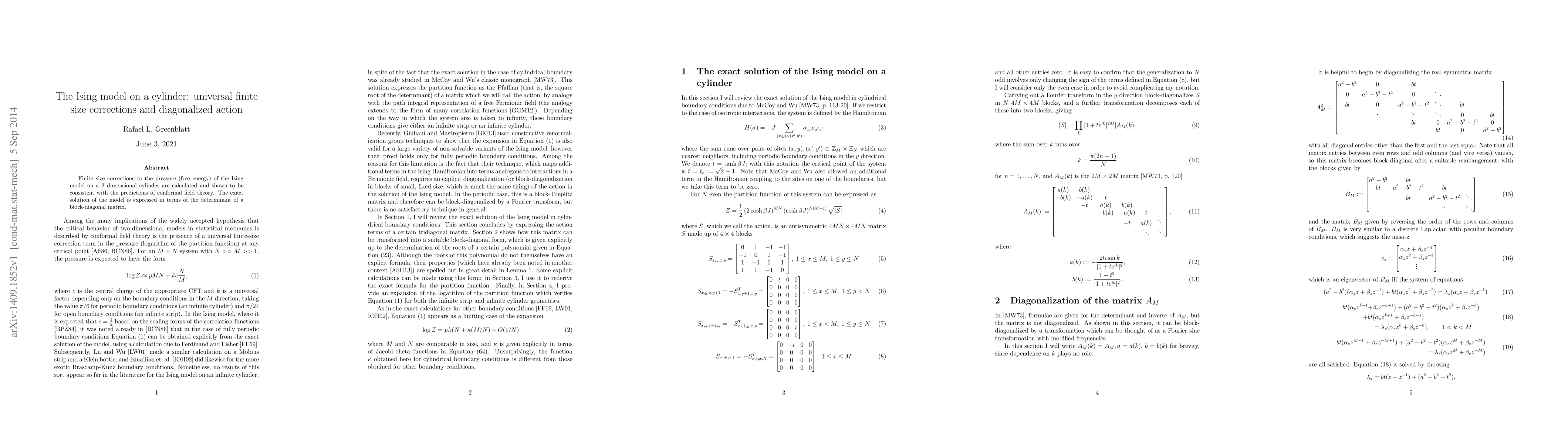 Summary: The paper calculates finite size corrections for the Ising model on a 2D cylinder, confirming predictions from conformal field theory, and presents an exact solution via the determinant of a block-diagonal matrix.