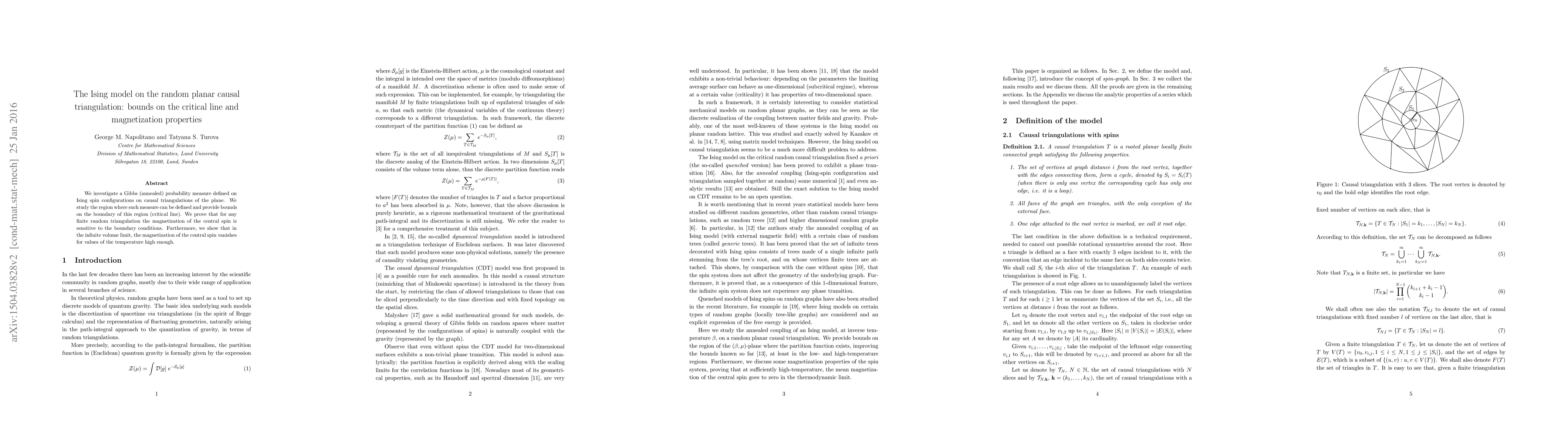 This research explores the behavior of the Ising model, a mathematical model of ferromagnetism, on random planar causal triangulations. It provides bounds on the critical line where the Gibbs measure, defining the probability of spin configurations, can be established. The study reveals that the magnetization of the central spin in finite triangulations is influenced by boundary conditions. In the infinite volume limit, the magnetization of the central spin approaches zero at high temperatures.