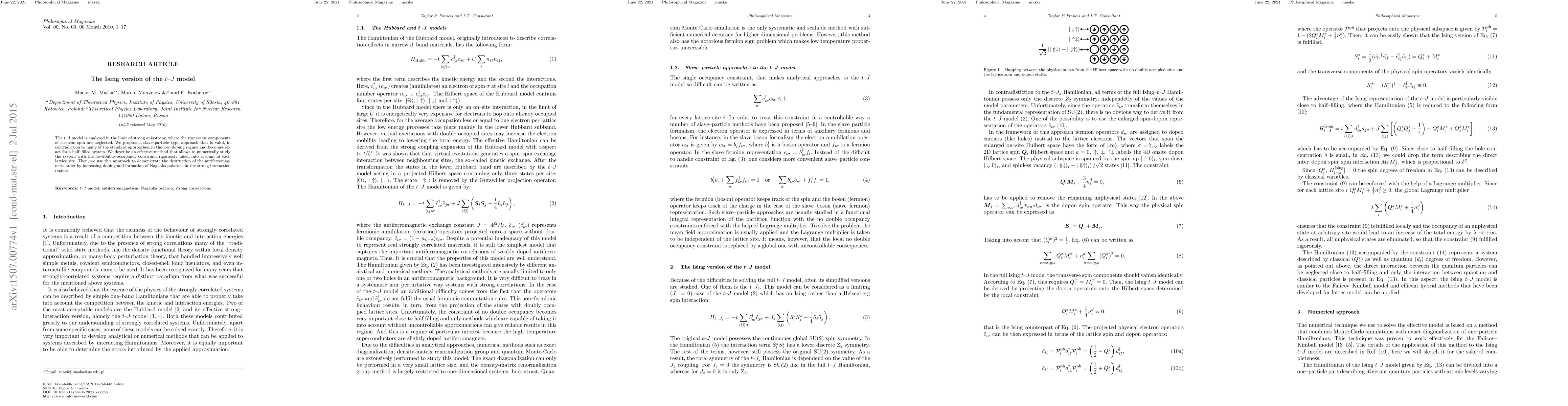 The t-J model is analysed in the limit of strong anisotropy, where the transverse components of electron spin are neglected. We propose a slave-particle-type approach that is valid, in contradiction to many of the standard approaches, in the low-doping regime and becomes exact for a half-filled system. We describe an effective method that allows to numerically study the system with the no-double-occupancy constraint rigorously taken into account at each lattice site. Then, we use this approach to demonstrate the destruction of the antiferromagnetic order by increasing the doping and formation of Nagaoka polarons in the strong interaction regime.