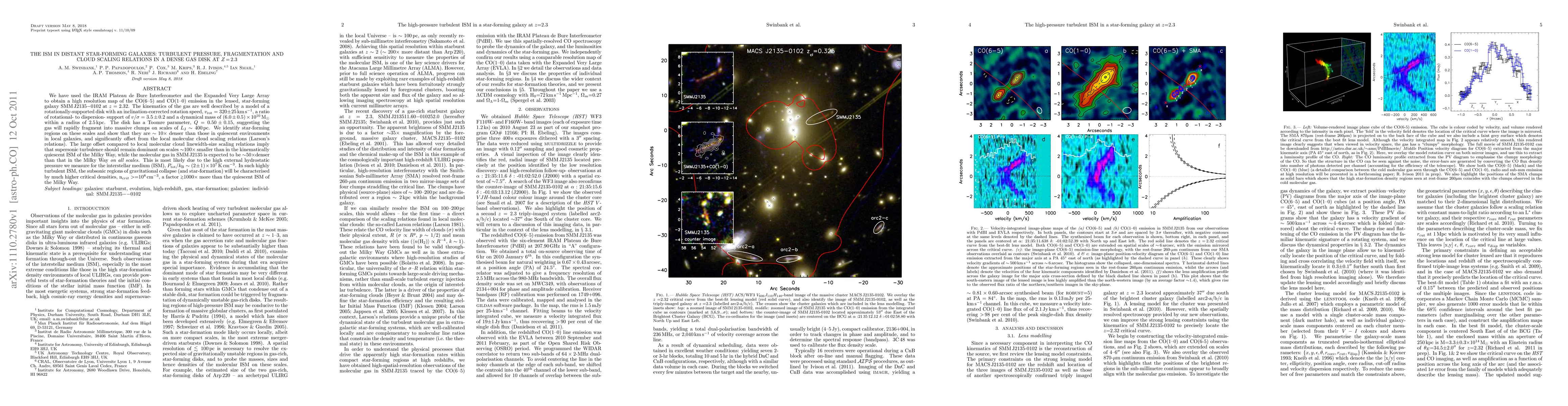 We have used the IRAM Plateau de Bure Interferometer and the Expanded Very Large Array to obtain a high resolution map of the CO(6-5) and CO(1-0) emission in the lensed, star-forming galaxy SMMJ2135-0102 at z=2.32. The kinematics of the gas are well described by a model of a rotationally-supported disk with an inclination-corrected rotation speed, v_rot = 320+/-25km/s, a ratio of rotational- to dispersion- support of v/sigma=3.5+/-0.2 and a dynamical mass of 6.0+/-0.5x10^10Mo within a radius of 2.5kpc. The disk has a Toomre parameter, Q=0.50+/-0.15, suggesting the gas will rapidly fragment into massive clumps on scales of L_J ~ 400pc. We identify star-forming regions on these scales and show that they are 10x denser than those in quiescent environments in local galaxies, and significantly offset from the local molecular cloud scaling relations (Larson's relations). The large offset compared to local molecular cloud linewidth-size scaling relations imply that supersonic turbulence should remain dominant on scales ~100x smaller than in the kinematically quiescent ISM of the Milky Way, while the molecular gas in SMMJ2135 is expected to be ~50x denser than that in the Milky Way on all scales. This is most likely due to the high external hydrostatic pressure we measure for the interstellar medium (ISM), P_tot/kB ~ (2+/-1)x10^7K/cm3. In such highly turbulent ISM, the subsonic regions of gravitational collapse (and star-formation) will be characterised by much higher critical densities, n_crit>=10^8/cm3, a factor ~1000x more than the quiescent ISM of the Milky Way.