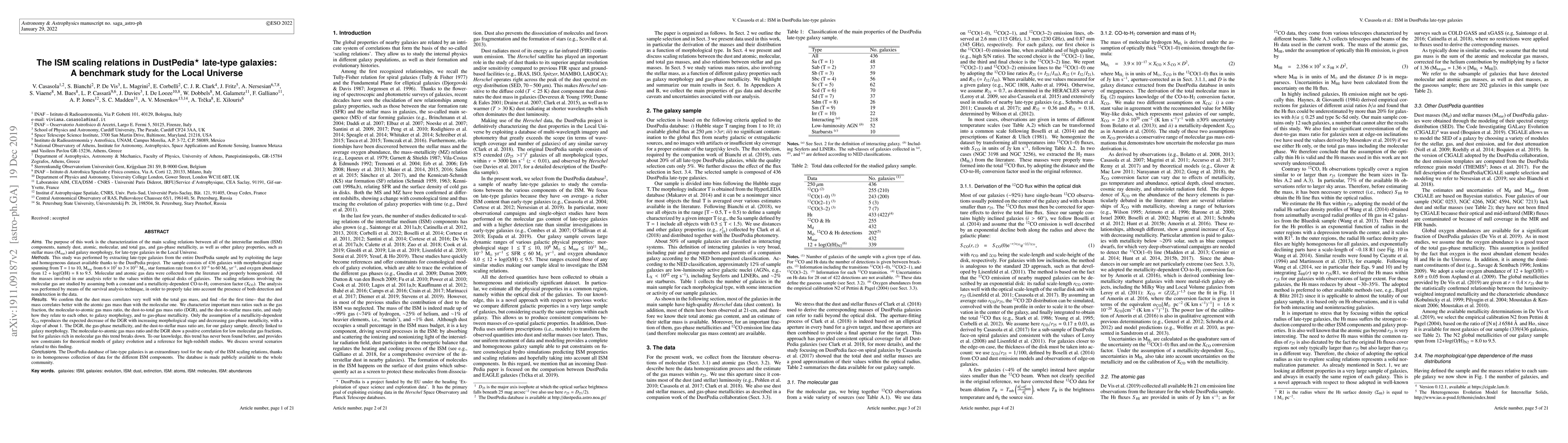 The purpose of this work is the characterization of the main scaling relations between all the ISM components (dust, atomic/molecular/total gas), gas-phase metallicity, and other galaxy properties, such as Mstar and galaxy morphology, for late-type galaxies in the Local Universe. This study is performed by extracting late-type galaxies from the entire DustPedia sample and by exploiting the large and homogeneous dataset available thanks to the DustPedia project. The sample consists of 436 galaxies with morphological stage from T = 1 to 10, Mstar from 6 x 10^7 to 3 x 10^11 Msun, SFR from 6 x 10^(-4) to 60 Msun/yr, and 12 + log(O/H) from 8 to 9.5. The scaling relations involving the molecular gas are studied by assuming both a constant and a metallicity-dependent XCO. The analysis has been performed by means of the survival analysis technique. We confirm that the dust mass correlates very well with the total gas mass, and find -- for the first time -- that the dust mass correlates better with the atomic gas mass than the molecular one. We characterize important mass ratios such as gas fraction, molecular-to-atomic gas mass ratio, dust-to-total gas mass ratio (DGR), and dust-to-stellar mass ratio. Only the assumption of a metallicity-dependent XCO reproduces the expected decrease of the DGR with increasing morphological stage and decreasing gas-phase metallicity, with a slope of about 1. DGR, gas-phase metallicity, and the dust-to-stellar mass ratio are, for our galaxy sample, directly linked to the galaxy morphology. The molecular-to-atomic gas mass ratio and the DGR show a positive correlation for low molecular gas fractions, but for molecular gas rich galaxies this trend breaks down. This trend has never been found previously, to our knowledge. It provides new constraints for theoretical models of galaxy evolution and a reference for high-redshift studies.