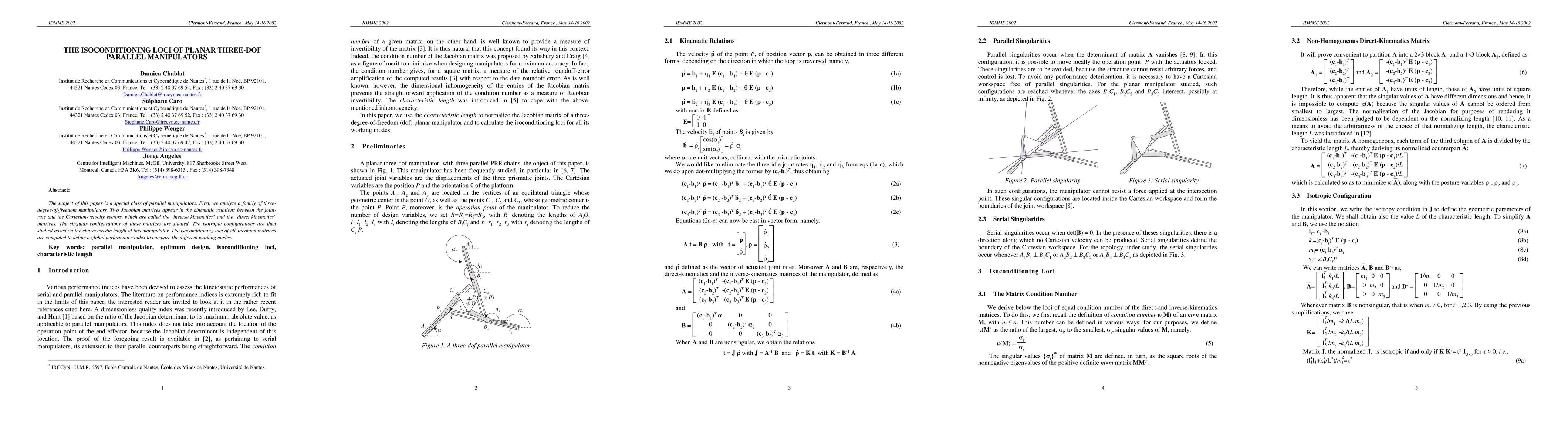 This paper investigates three-degree-of-freedom planar parallel manipulators, analyzing their Jacobian matrices and singular configurations. It computes the isoconditioning loci to establish a global performance index for comparing different operational modes.