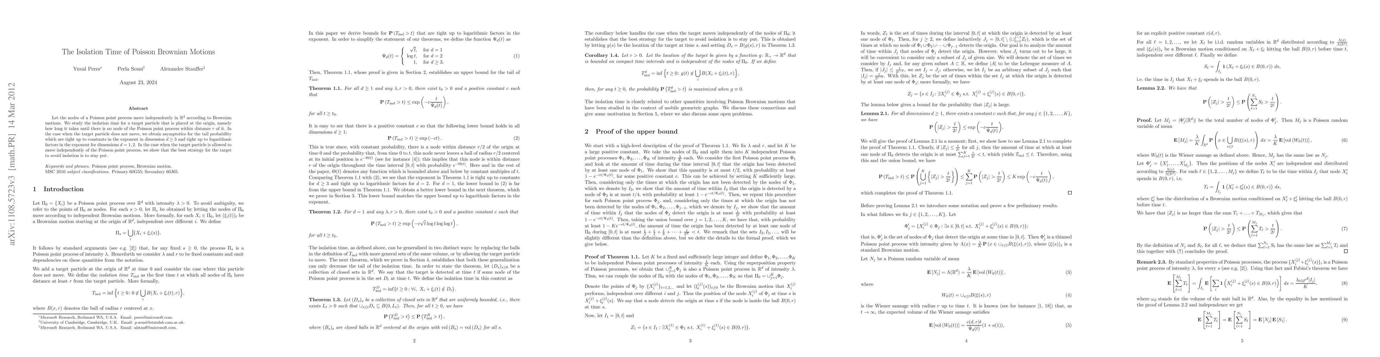 Let the nodes of a Poisson point process move independently in $\R^d$ according to Brownian motions. We study the isolation time for a target particle that is placed at the origin, namely how long it takes until there is no node of the Poisson point process within distance $r$ of it. In the case when the target particle does not move, we obtain asymptotics for the tail {probability} which are tight up to constants in the exponent in dimension $d\geq 3$ and tight up to logarithmic factors in the exponent for dimensions $d=1,2$. In the case when the target particle is allowed to move independently of the Poisson point process, we show that the best strategy for the target to avoid isolation is to stay put.