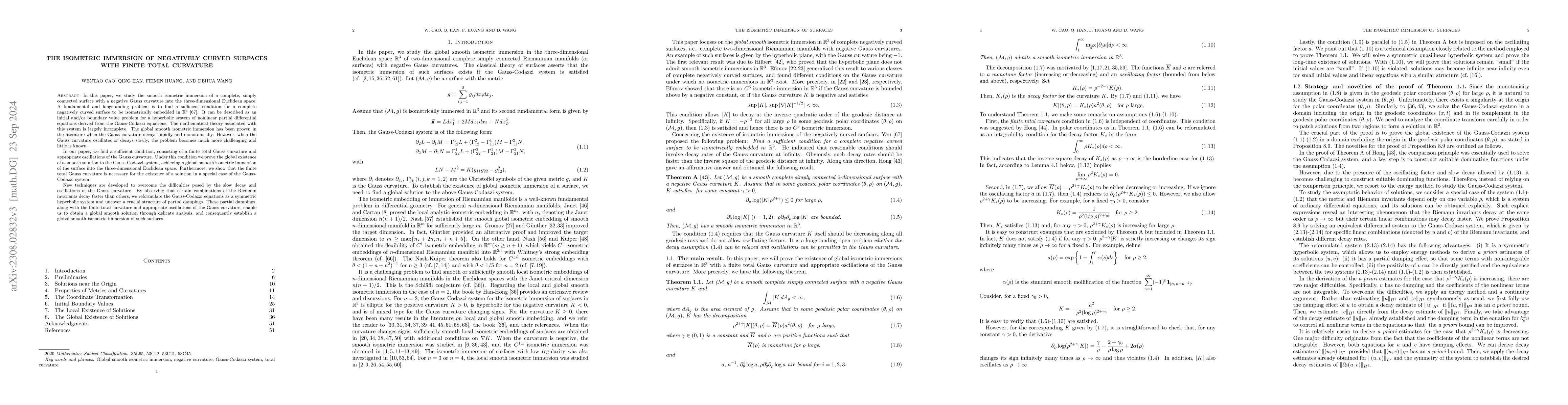 In this paper, we study the smooth isometric immersion of a complete simply connected surface with a negative Gauss curvature in the three-dimensional Euclidean space. For a surface with a finite total Gauss curvature and appropriate oscillations of the Gauss curvature, we prove the global existence of a smooth solution to the Gauss-Codazzi system and thus establish a global smooth isometric immersion of the surface into the three-dimensional Euclidean space. Based on a crucial observation that some linear combinations of the Riemann invariants decay faster than others, we reformulate the Gauss-Codazzi system as a symmetric hyperbolic system with a partial damping. Such a damping effect and an energy approach permit us to derive global decay estimates and meanwhile control the non-integrable coefficients of nonlinear terms.