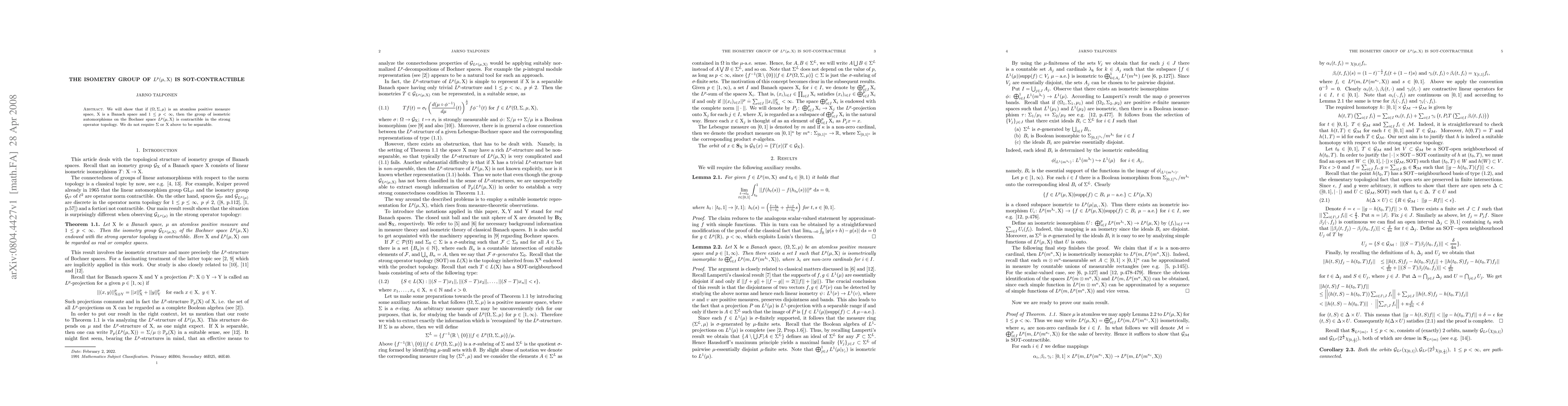 This paper demonstrates that the group of isometric automorphisms on the Bochner space \( L^{p}(\mu,X) \) is contractible in the strong operator topology, provided the measure space is atomless and \( X \) is a Banach space. The result holds without requiring separability of \( \Sigma \) or \( X \).