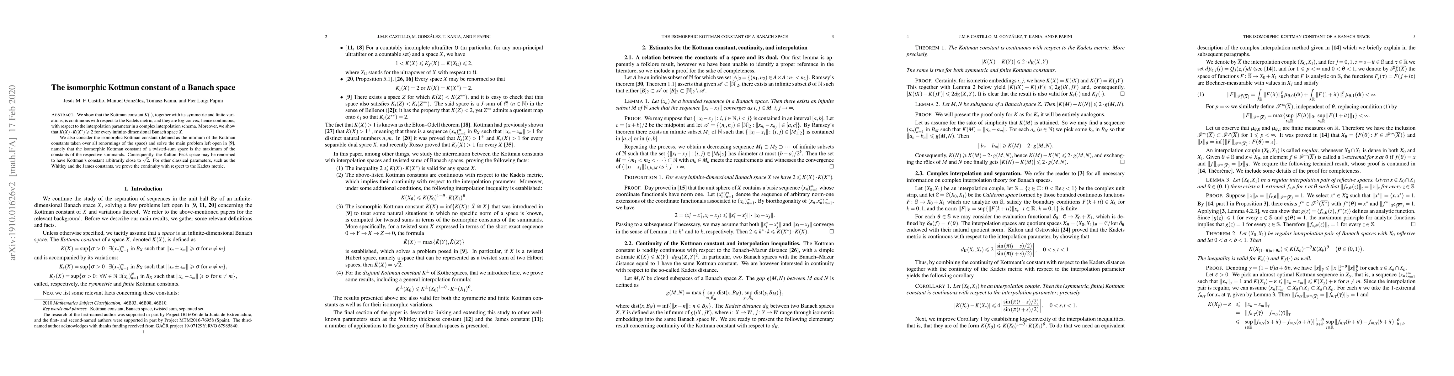 The paper proves the continuity of Kottman constants with respect to various metrics and interpolation parameters, and establishes a lower bound for these constants in infinite-dimensional Banach spaces.