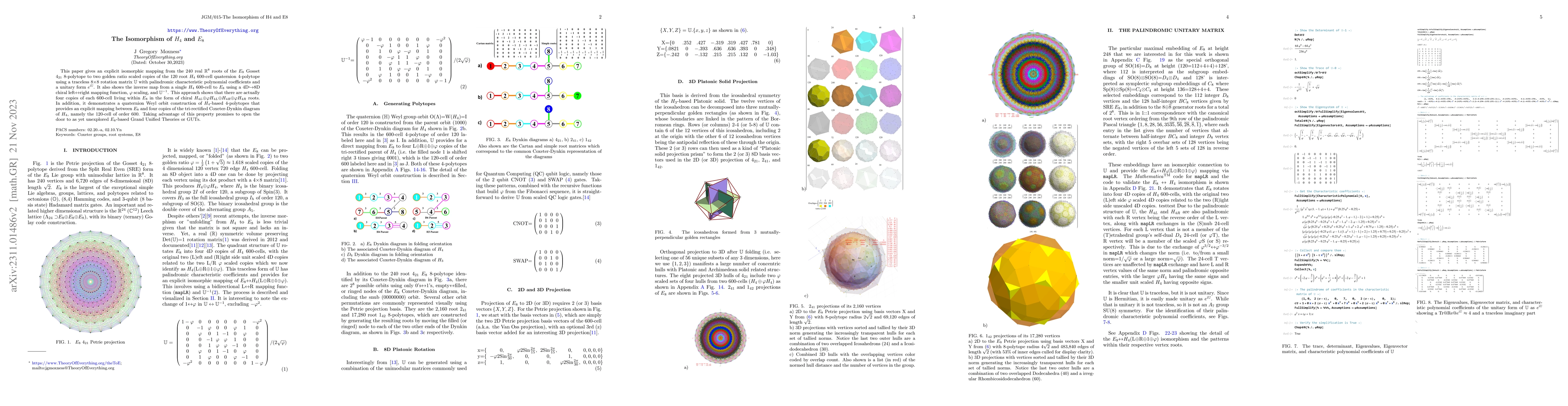 This paper gives an explicit isomorphic mapping from the 240 real $\mathbb{R}^{8}$ roots of the $E_8$ Gosset $4_{21}$ 8-polytope to two golden ratio scaled copies of the 120 root $H_4$ 600-cell quaternion 4-polytope using a traceless 8$\times$8 rotation matrix $\mathbb{U}$ with palindromic characteristic polynomial coefficients and a unitary form $e^{\text {i$\mathbb{U}$}}$. It also shows the inverse map from a single $H_4$ 600-cell to $E_8$ using a 4D$\hookrightarrow$8D chiral left$\leftrightarrow$right mapping function, $ \varphi$ scaling, and $\mathbb{U}^{-1}$. This approach shows that there are actually four copies of each 600-cell living within $E_8$ in the form of chiral $H_{4L}$$\oplus$$\varphi H_{4L}$$\oplus$$H_{4R}$$\oplus$$\varphi H_{4R}$ roots. In addition, it demonstrates a quaternion Weyl orbit construction of $H_4$-based 4-polytopes that provides an explicit mapping between $E_8$ and four copies of the tri-rectified Coxeter-Dynkin diagram of $H_4$, namely the 120-cell of order 600. Taking advantage of this property promises to open the door to as yet unexplored $E_8$-based Grand Unified Theories or GUTs.