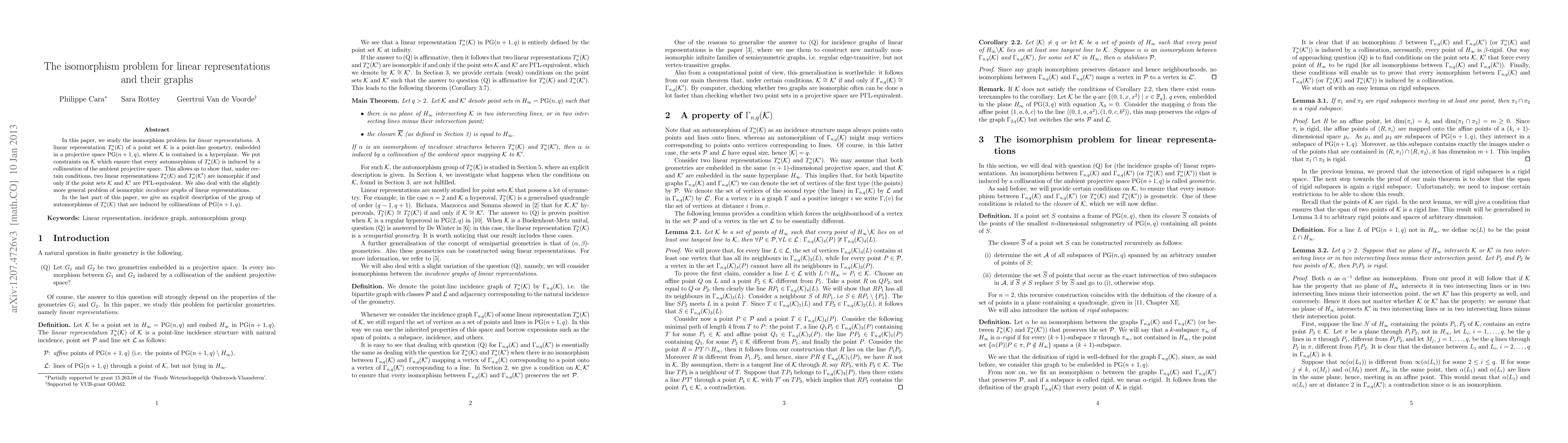 Researchers studied the isomorphism problem for linear representations in geometry, finding that two representations are isomorphic if their point sets are PGammaL-equivalent. They also described the group of automorphisms induced by collineations.