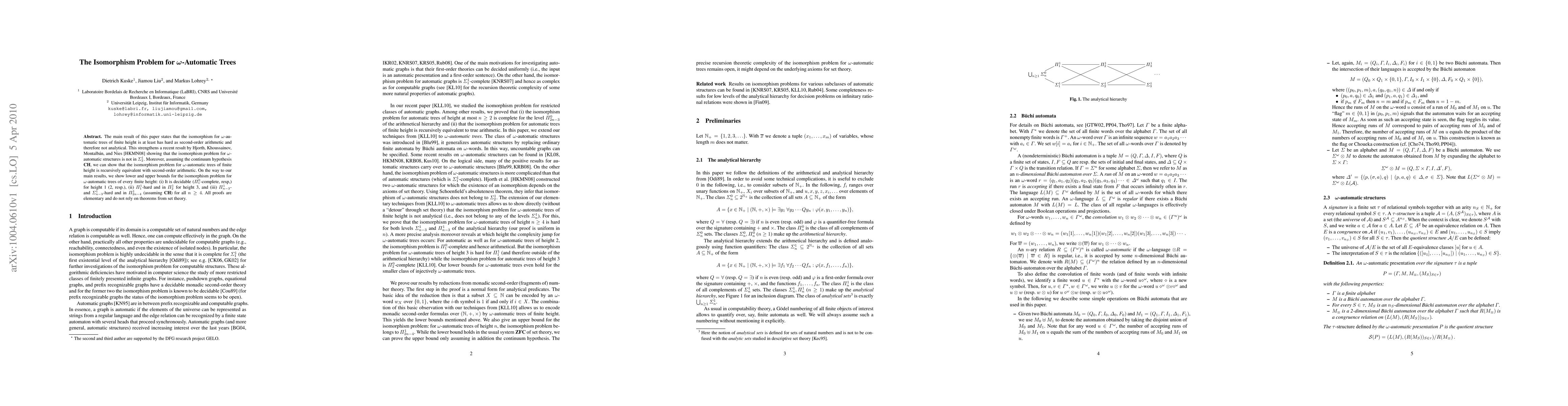 This paper demonstrates that the isomorphism problem for omega-automatic trees of finite height is at least as hard as second-order arithmetic, thus not analytical. It also establishes recursive equivalence with second-order arithmetic under the continuum hypothesis, and provides decidability and complexity bounds for trees of various finite heights.