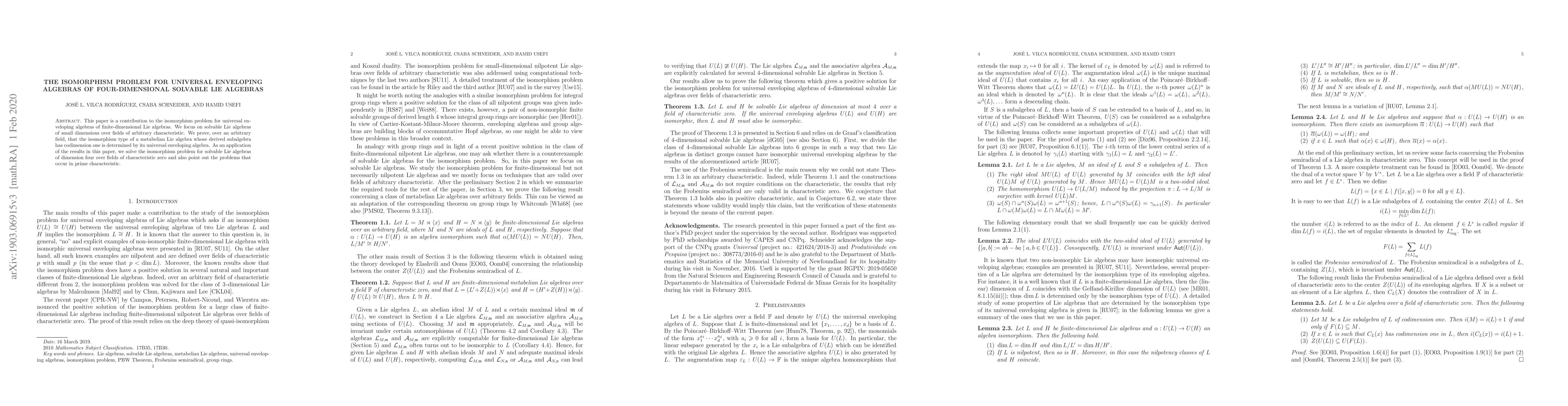 This paper is a contribution to the isomorphism problem for universal enveloping algebras of finite-dimensional Lie algebras. We focus on solvable Lie algebras of small dimensions over fields of arbitrary characteristic. We prove, over an arbitrary field, that the isomorphism type of a metabelian Lie algebra whose derived subalgebra has codimension one is determined by its universal enveloping algebra. As an application of the results in this paper, we solve the isomorphism problem for solvable Lie algebras of dimension four over fields of characteristic zero and also point out the problems that occur in prime characteristic.