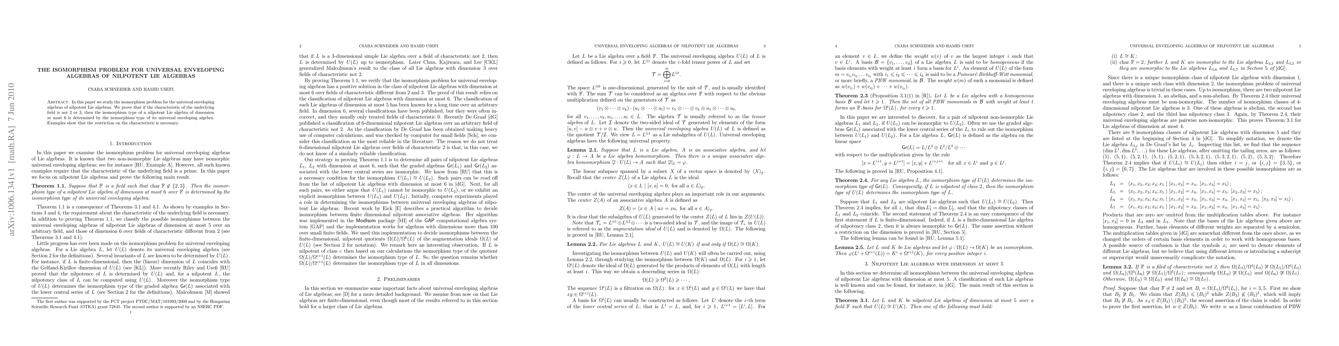 The paper presents detailed algebraic proofs and classifications of isomorphisms for universal enveloping algebras of nilpotent Lie algebras, particularly focusing on dimensions up to 6 and characteristics other than 2 and 3.